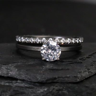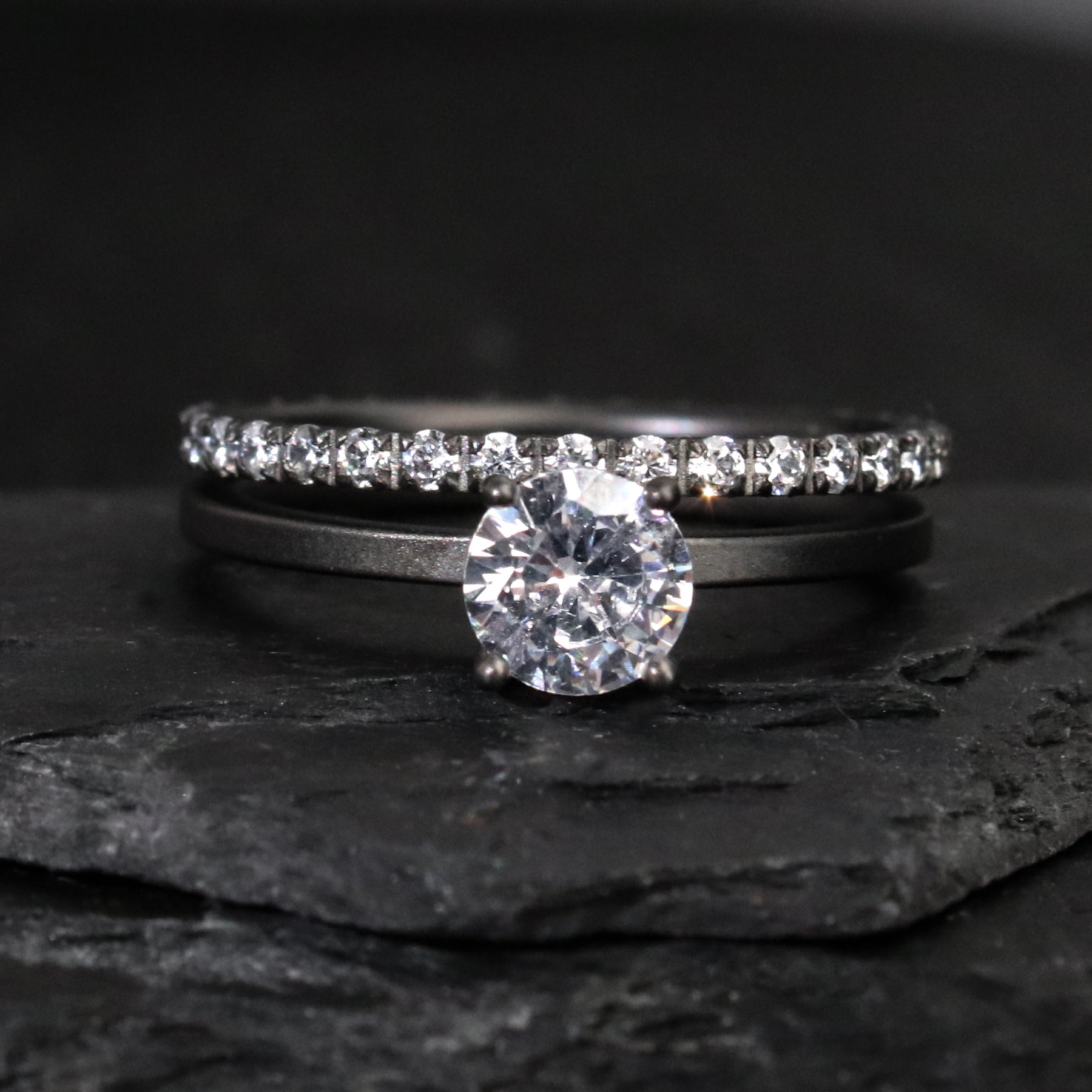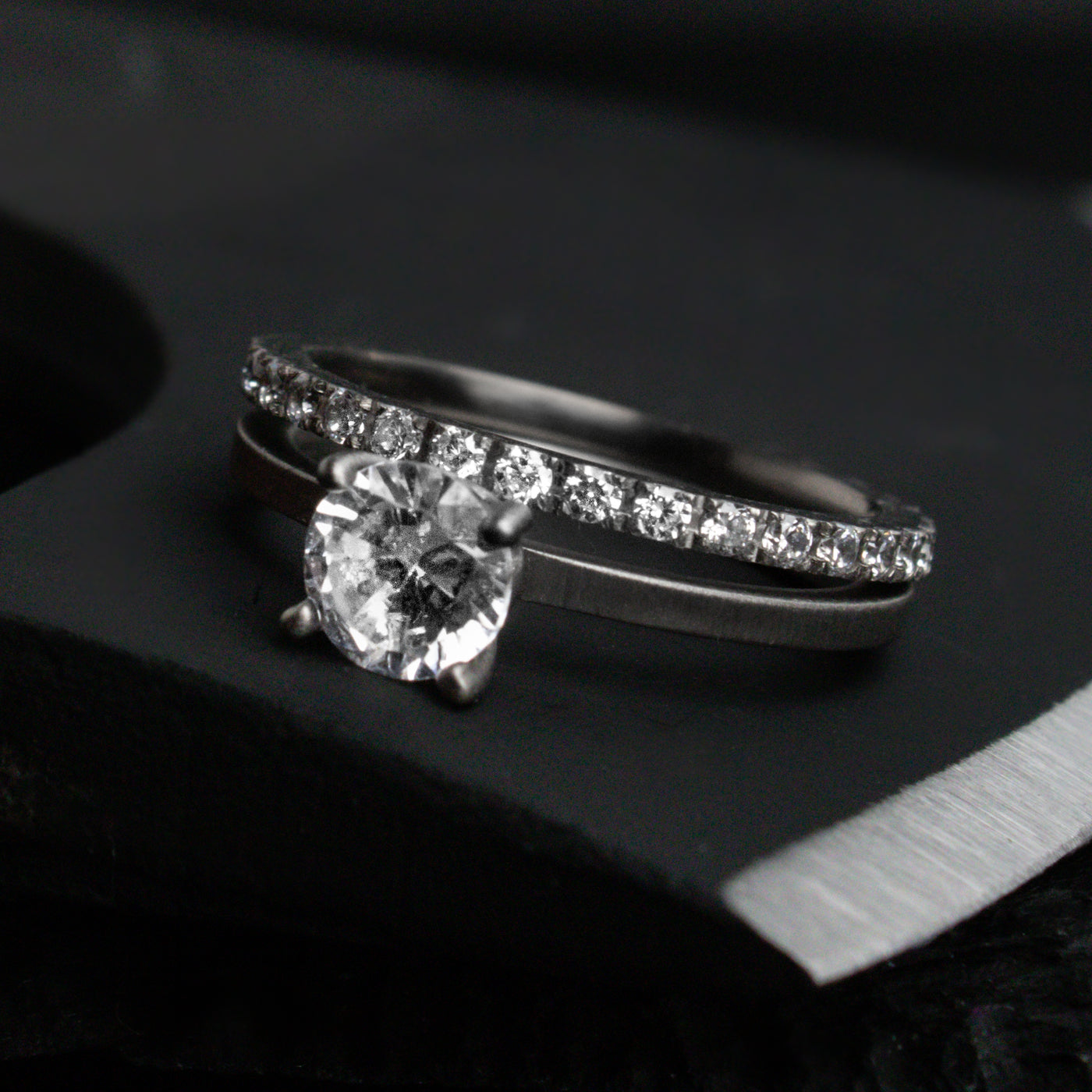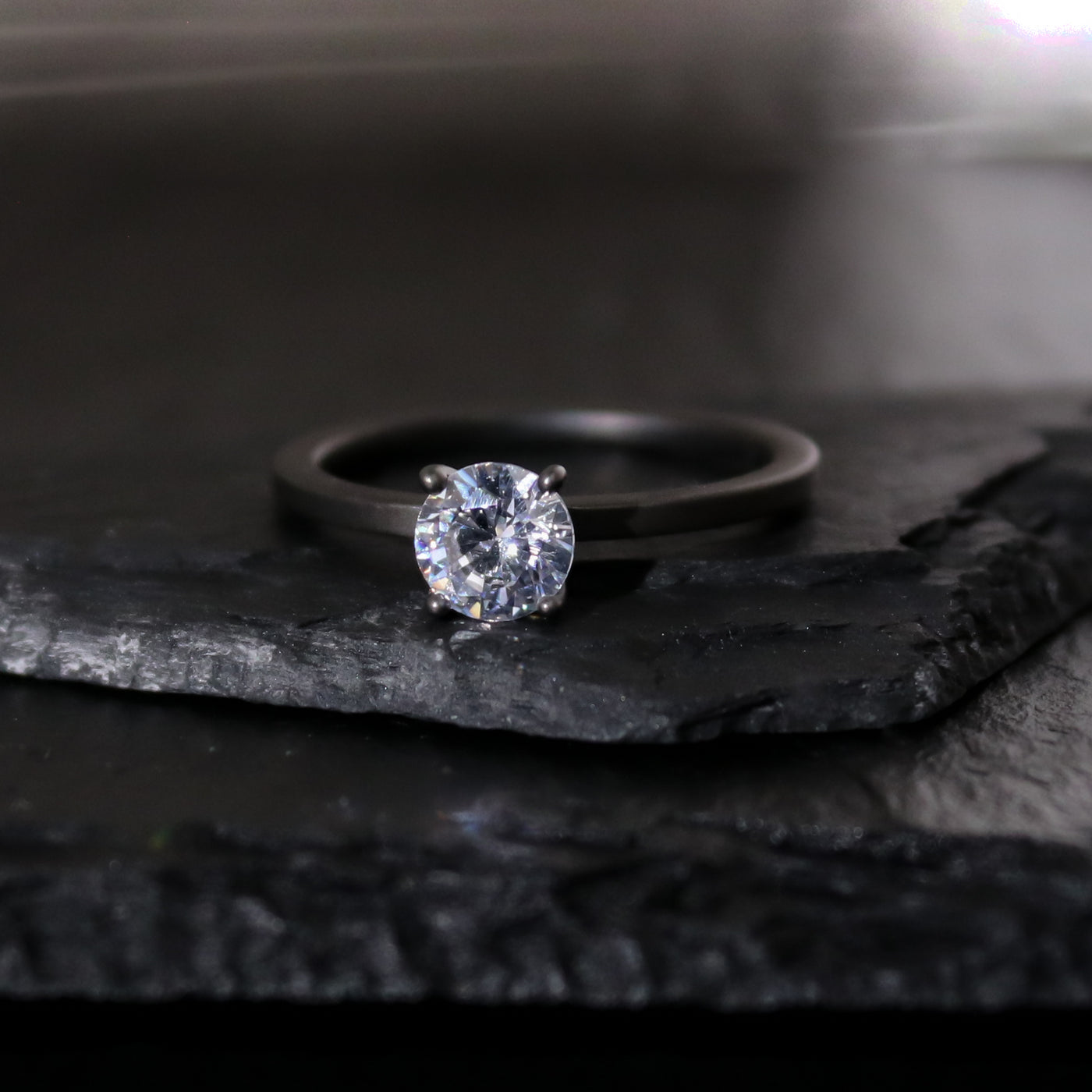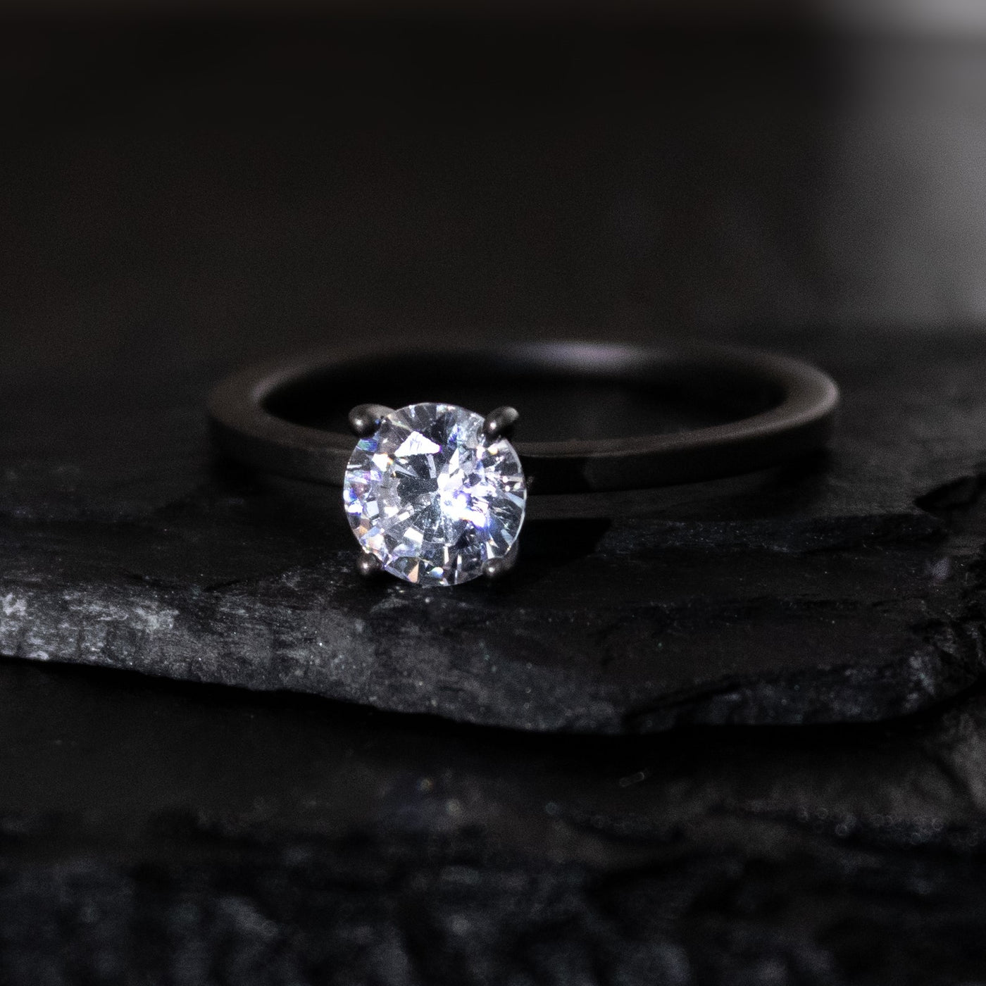 Turn your man into stone with The Medusa, a new and unique engagement ring from Thorum. Outfitted with sandblasted black Titanium and a brilliant round stone of Moissanite.