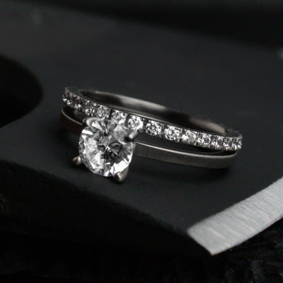 Titanium is incredibly difficult to work into the shape of this feminine engagement ring. We craft this band using multiple mills/lathes and lasers, using techniques we've mastered throughout our nearly 10 years of making wedding rings.