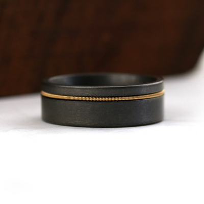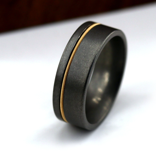 This rustic sandblasted gray Tungsten Carbide wedding band is outfitted with a .032" phospher bronze guitar string. The first design I ever made on my lathe (because I wanted one!), reimagined with a badass Tungsten Carbide gunmetal finish.