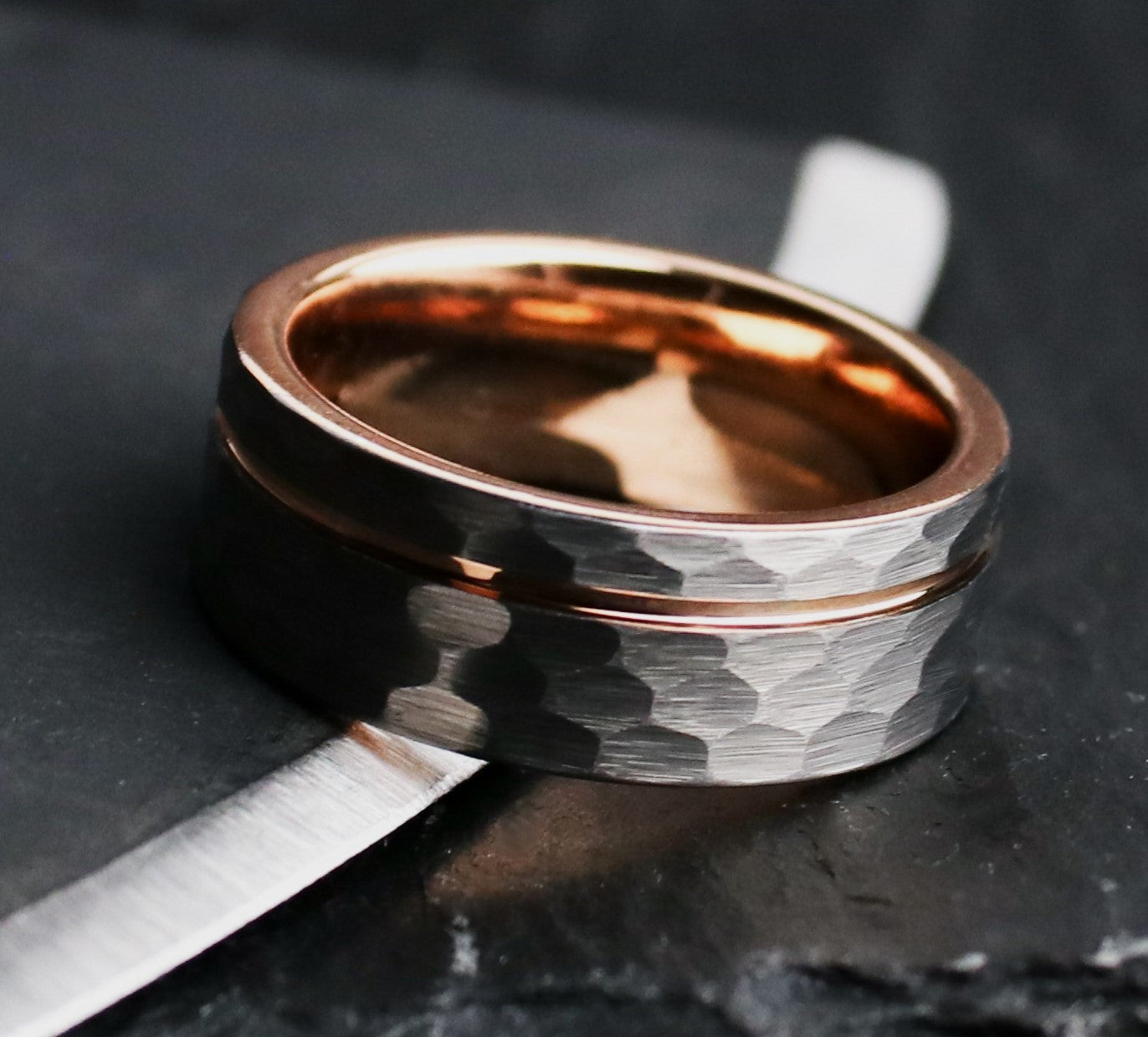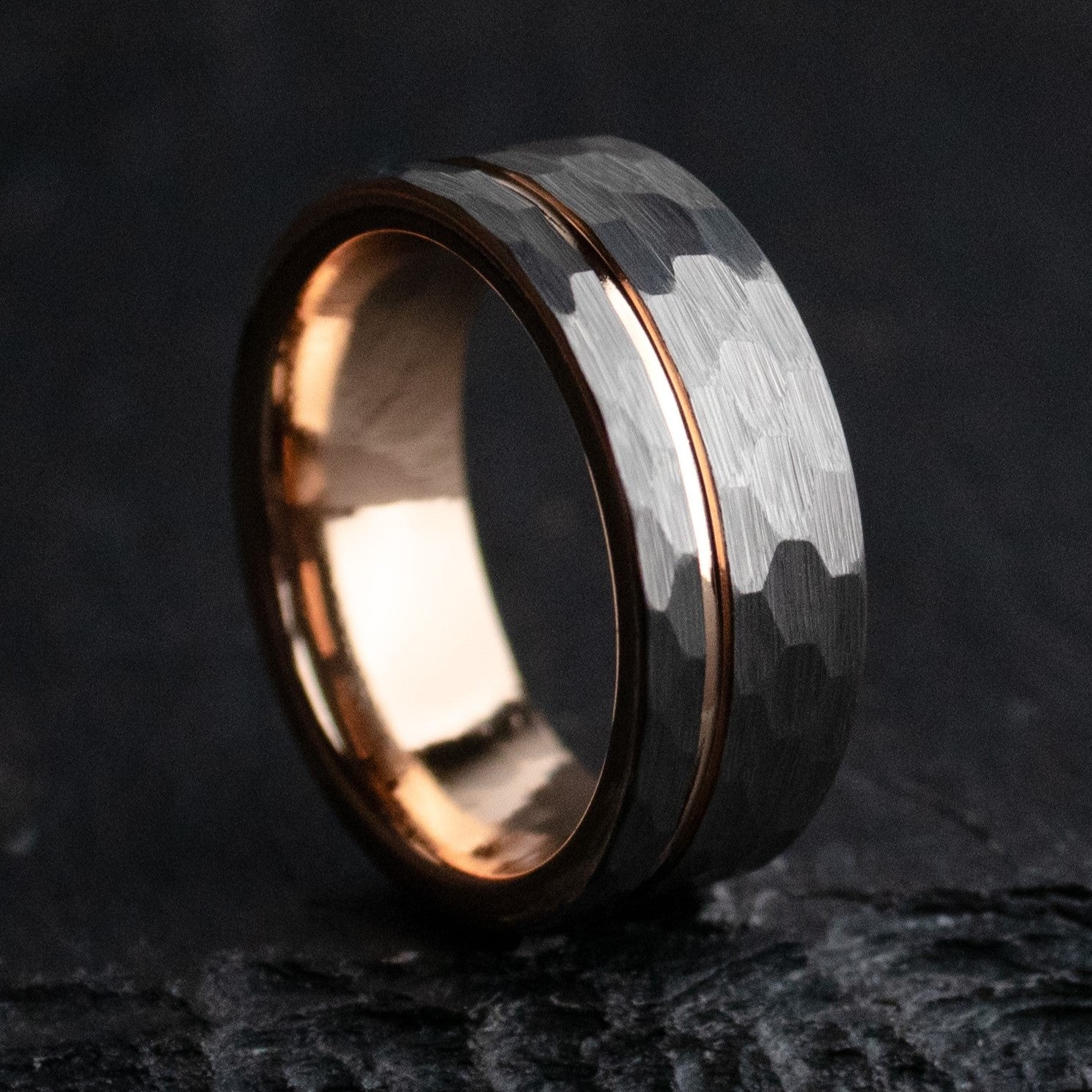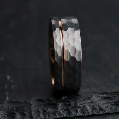 We use Tungsten Carbide to cut Titanium. That's how strong it is. It's an absolute marvel of modern engineering, and ranks a 9-9.5 on Mohs hardness scale (scales out of 10). This design pairs a rustic, hammered, gray tungsten carbide exterior, with a rose gold coated inlay, and interior. The ring is forged via sintering in an industrial mold, and I polish it with diamond paste.