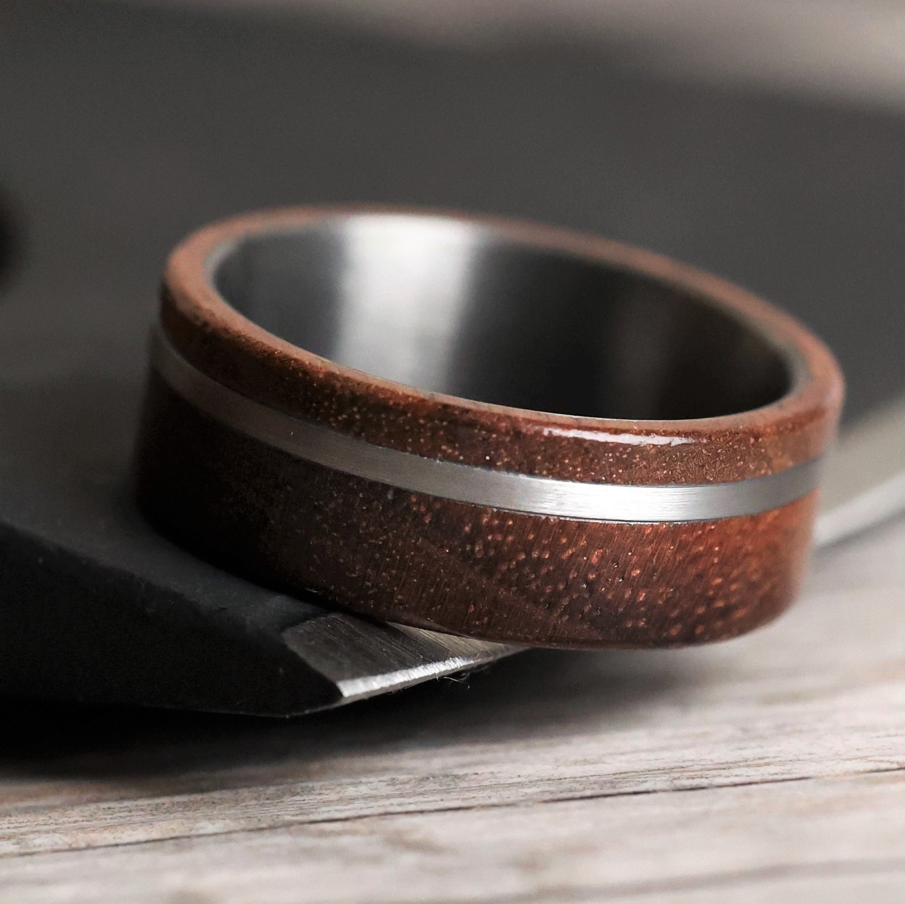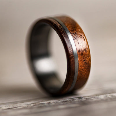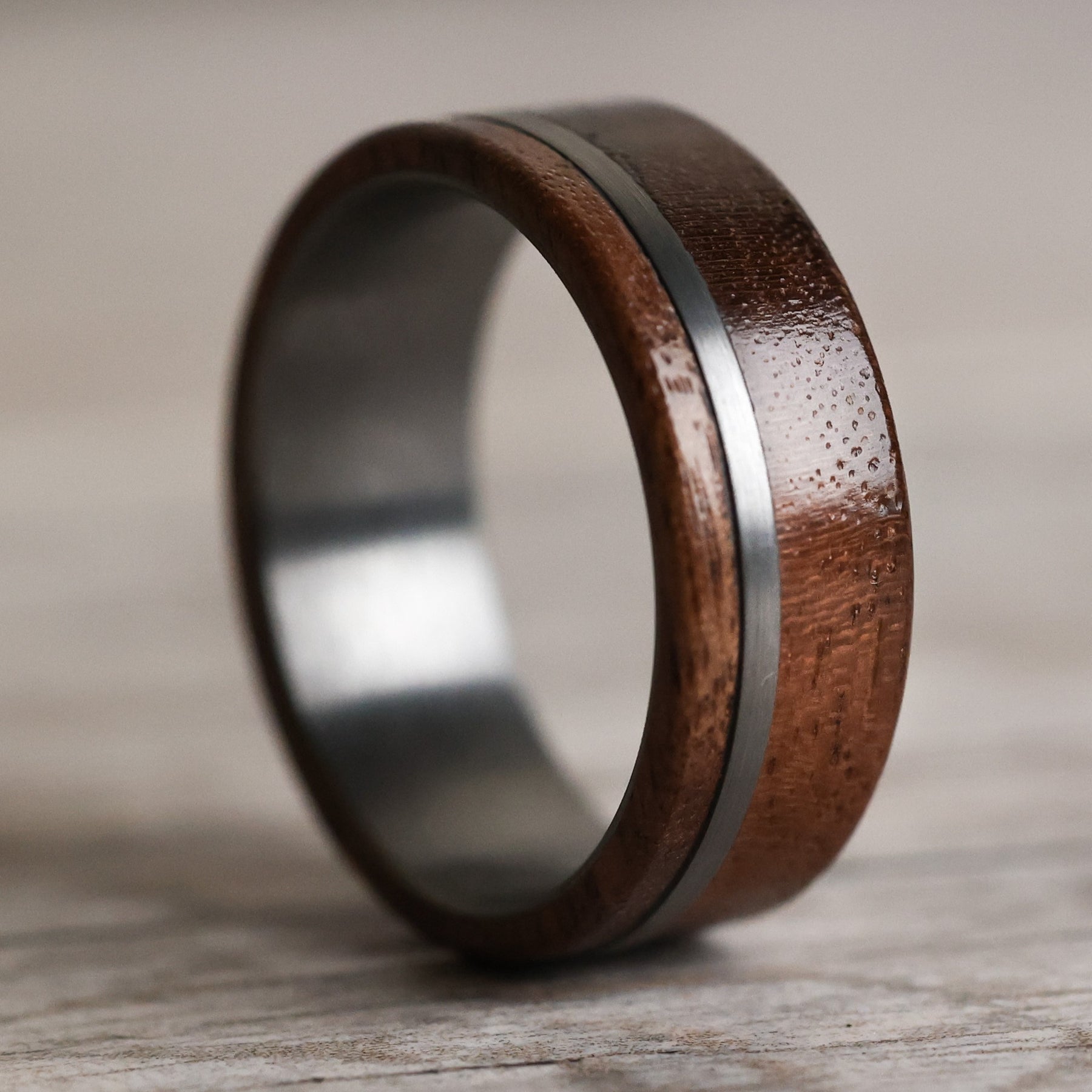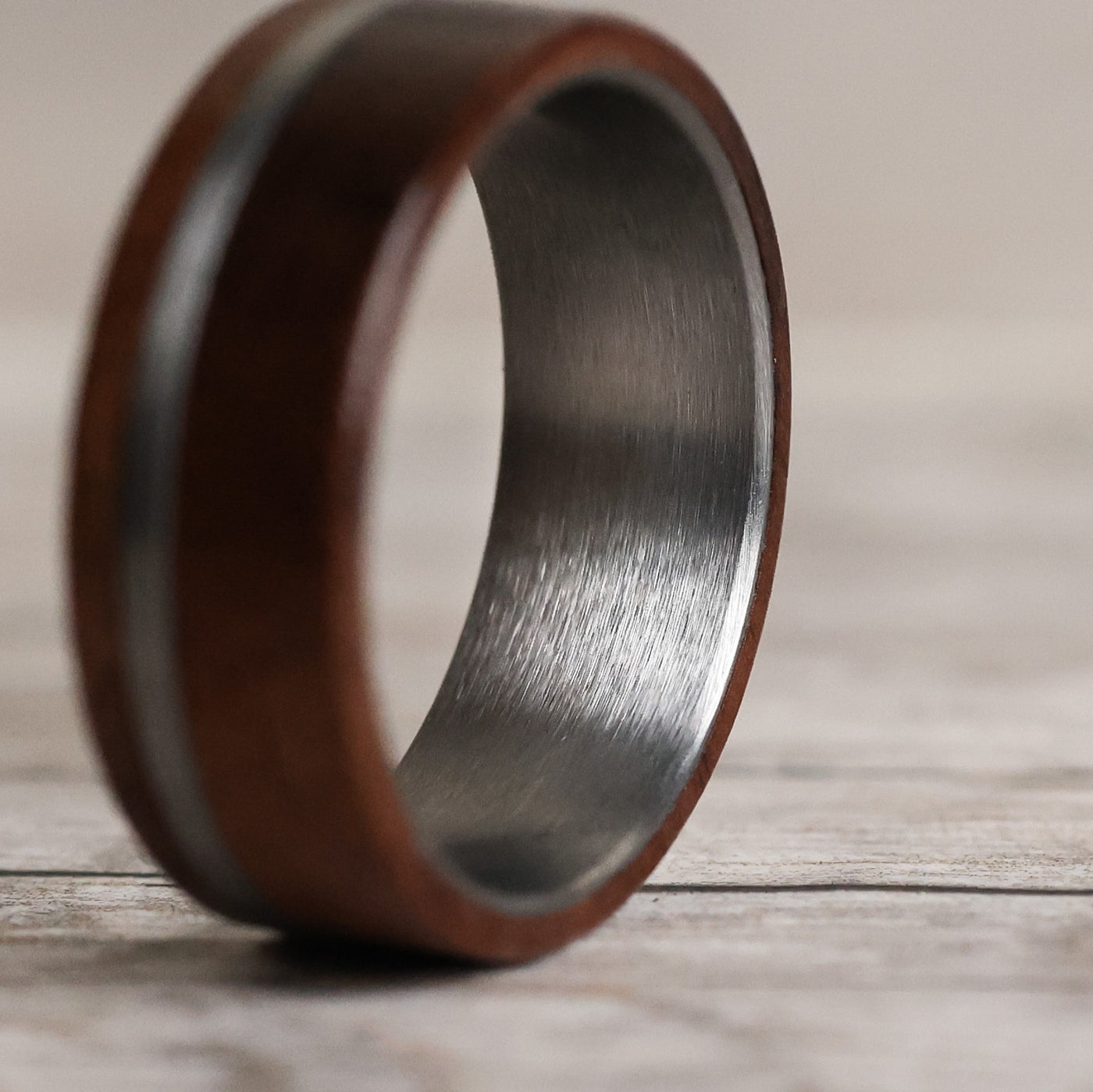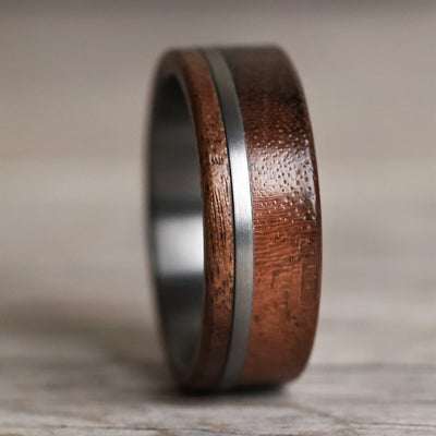 The dark coffee toned grains of Walnut in this wedding band are complimented by the distinguished, brushed Tungsten Carbide. Tungsten Carbide is the paragon of modern metalworking, with a Moh's hardness of upwards of 9-9.5 (only second to diamond).