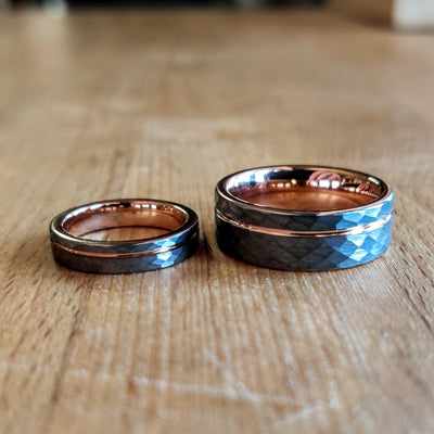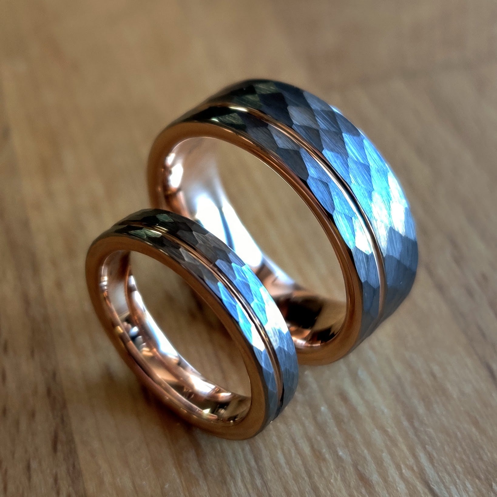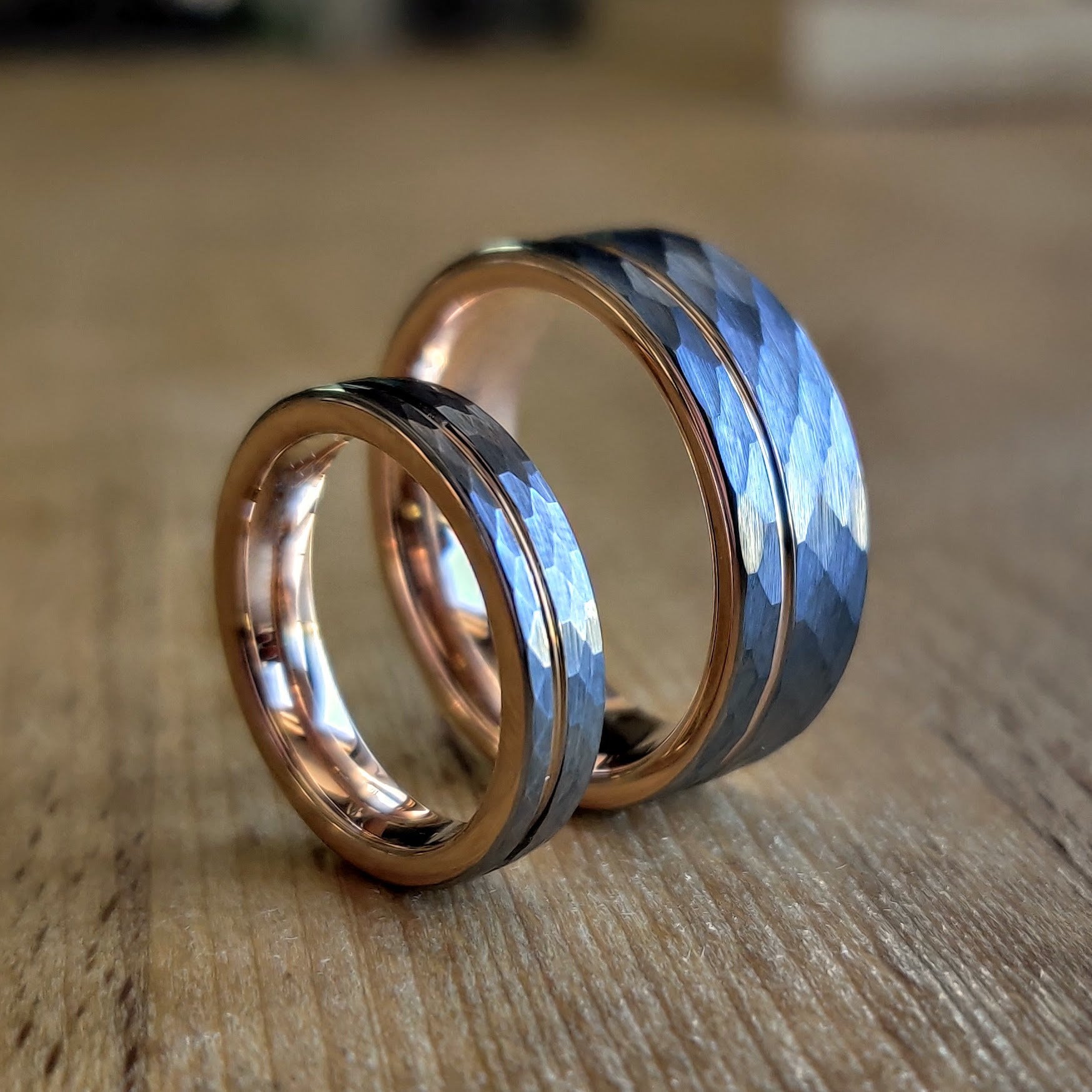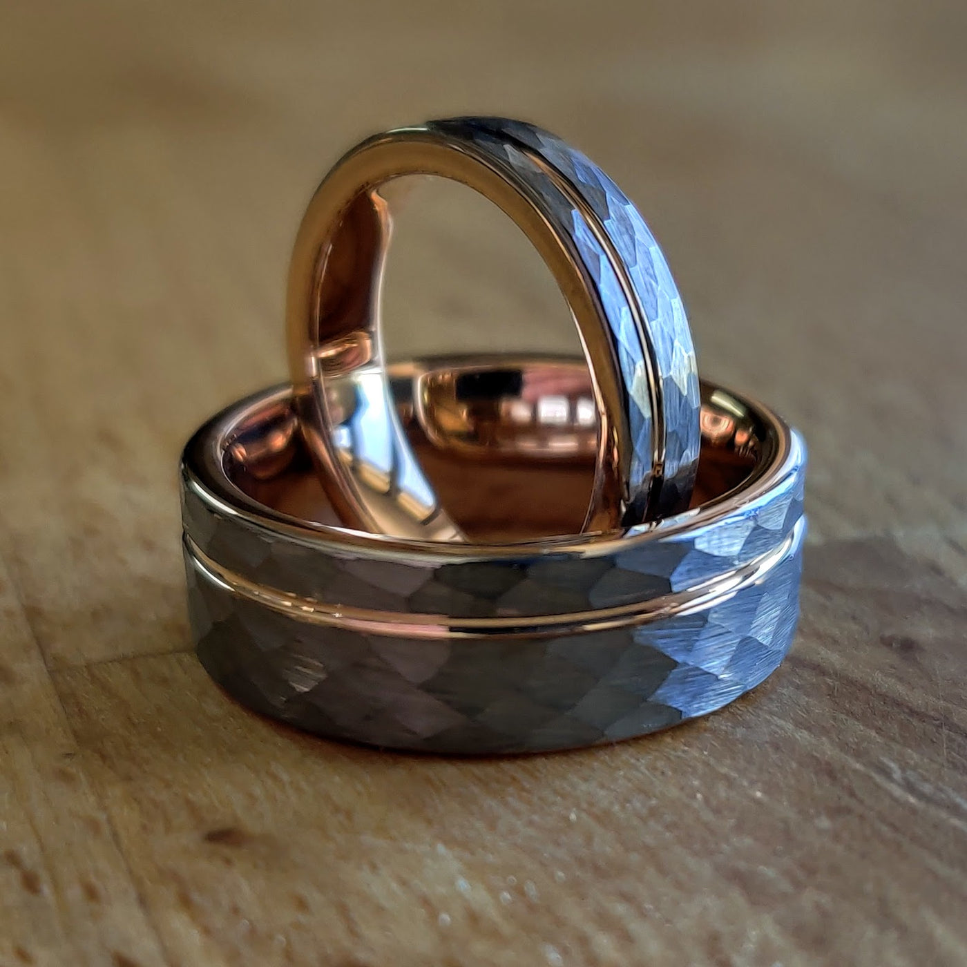 This design is perfect as engagement rings, wedding rings, promise rings, or for any occasion. The design pairs a rustic, hammered, gray tungsten carbide exterior, with a rose gold inlay, and interior. The rings are forged via sintering in an industrial mold, and I polish it with diamond paste.