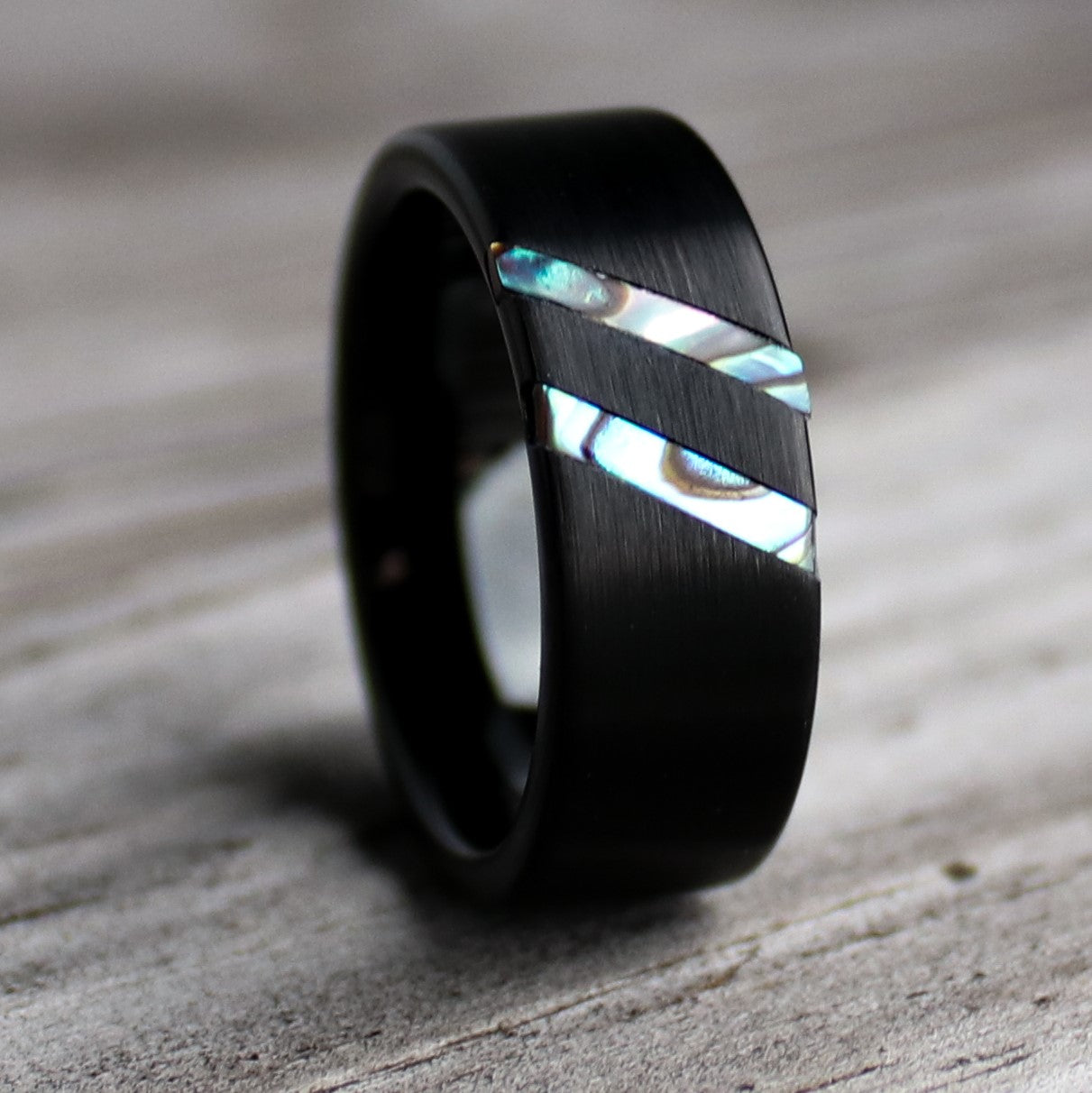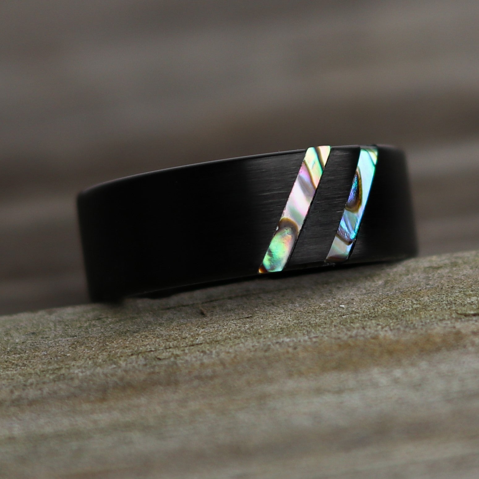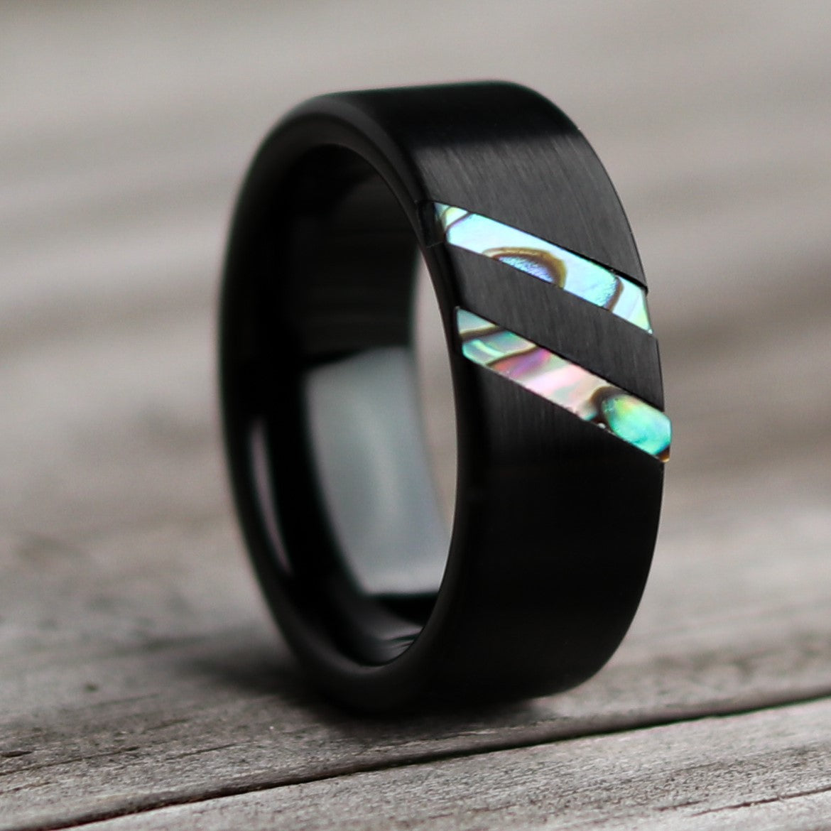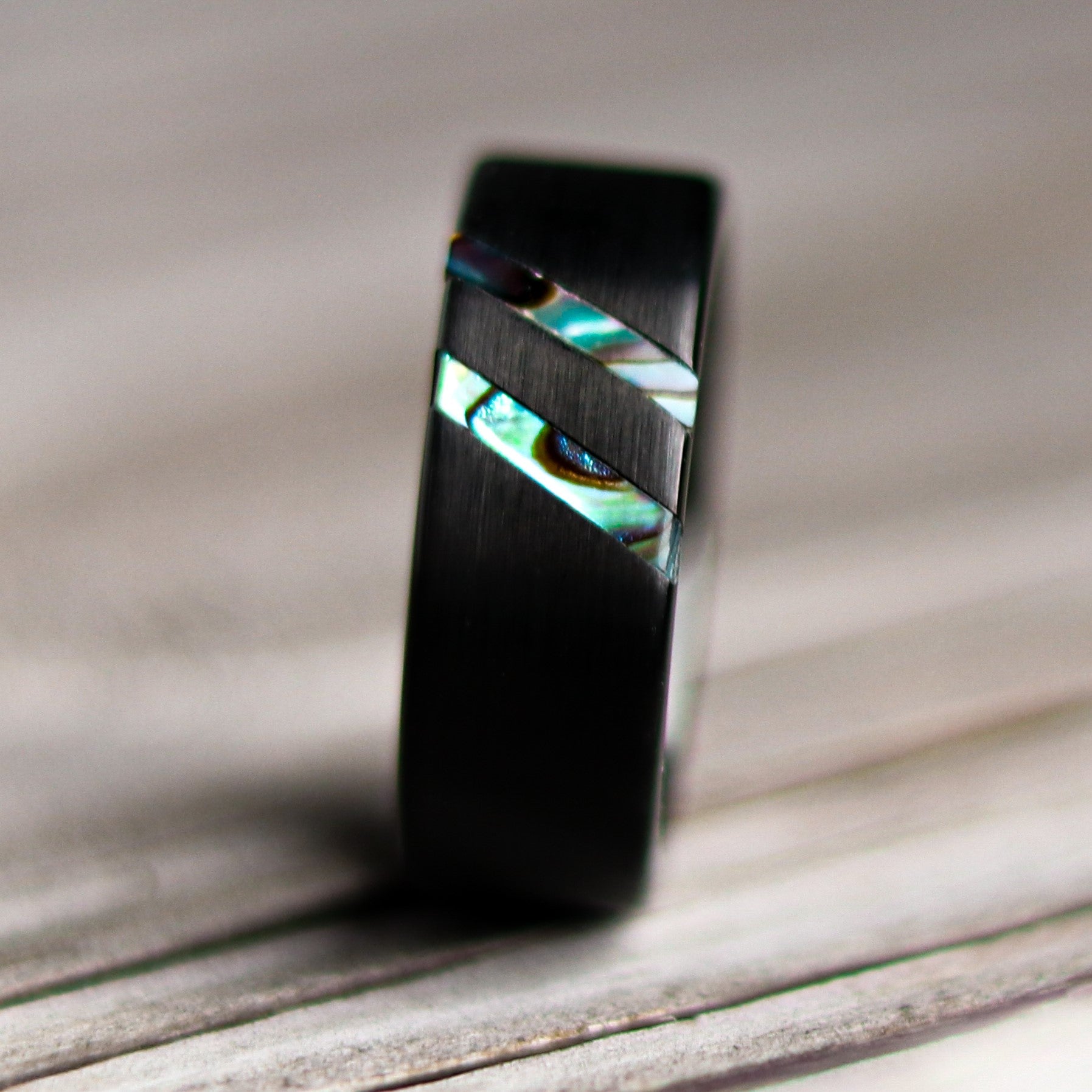Whether you're a scuba diver, fisherman, or you simply long for the sea - we made this wedding band for you. Black Tungsten Carbide is paired with two mitred pairs of the Abalone, placed at 45 degrees for a modern aesthetic.