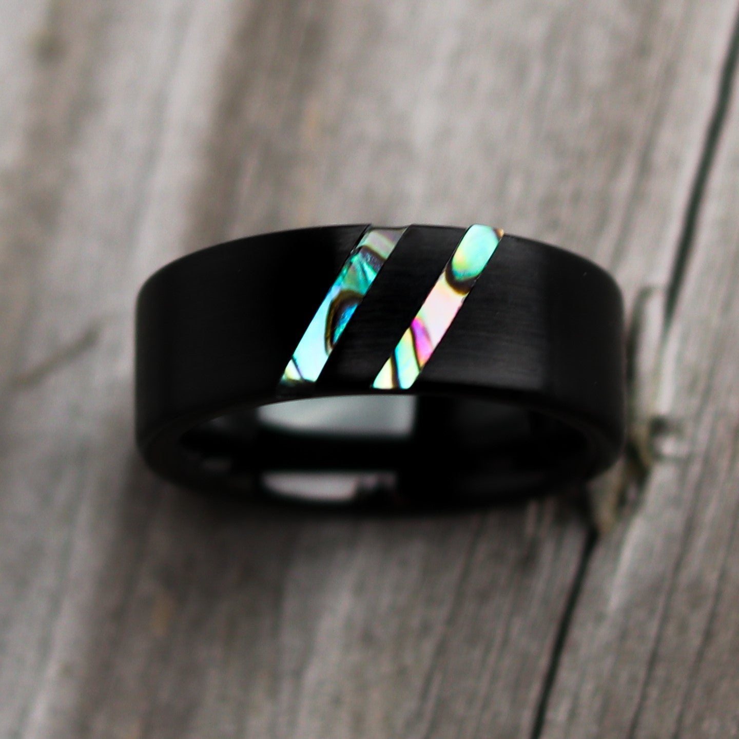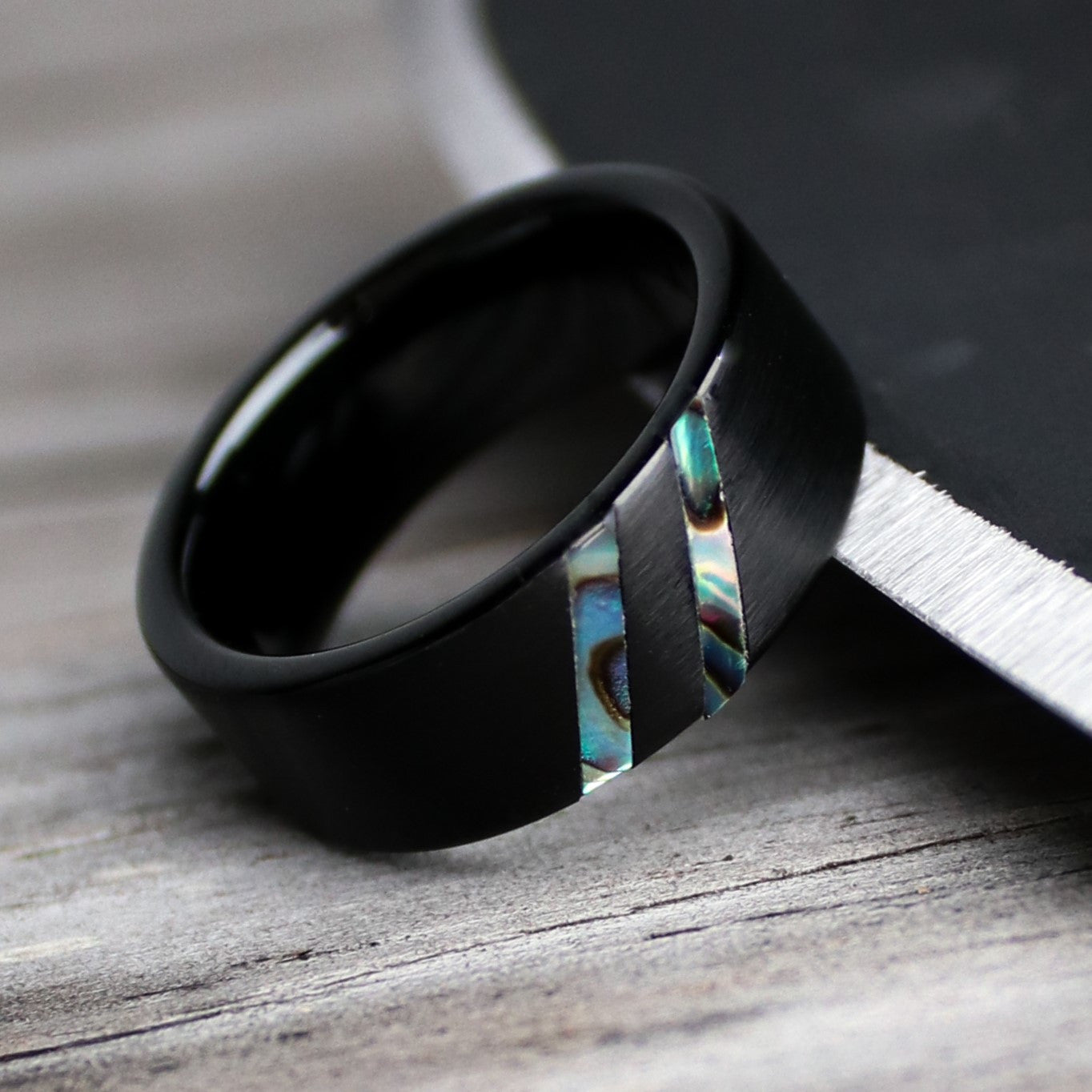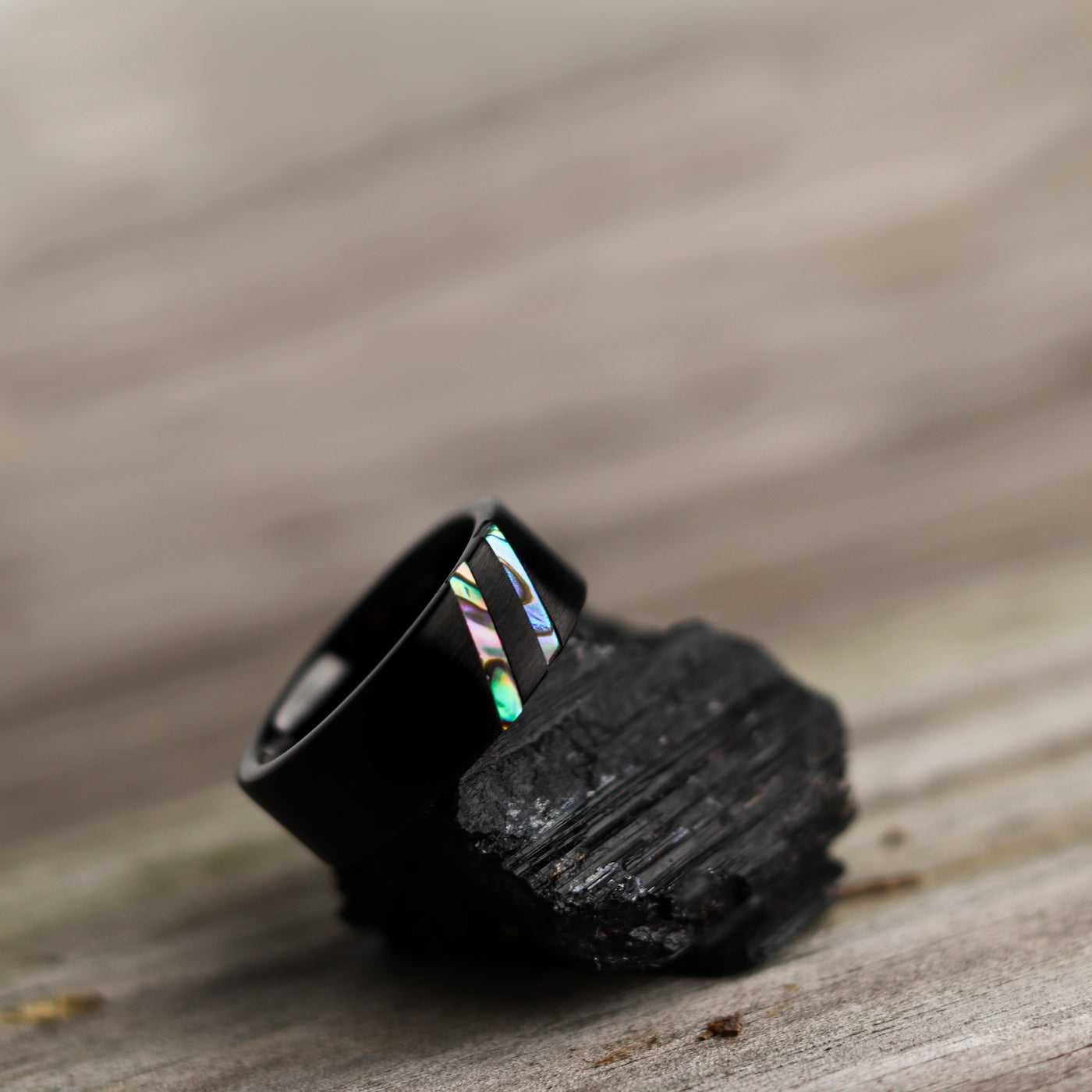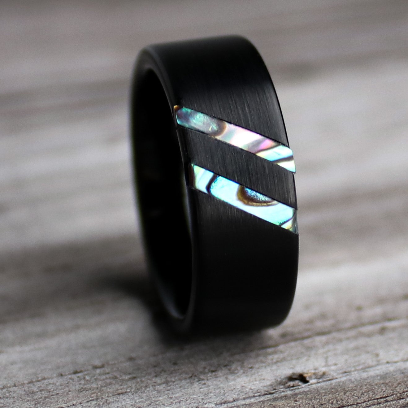 Whether you're a scuba diver, fisherman, or you simply long for the sea - we made this wedding band for you. Black Tungsten Carbide is paired with two mitred pairs of the Abalone, placed at 45 degrees for a modern aesthetic.