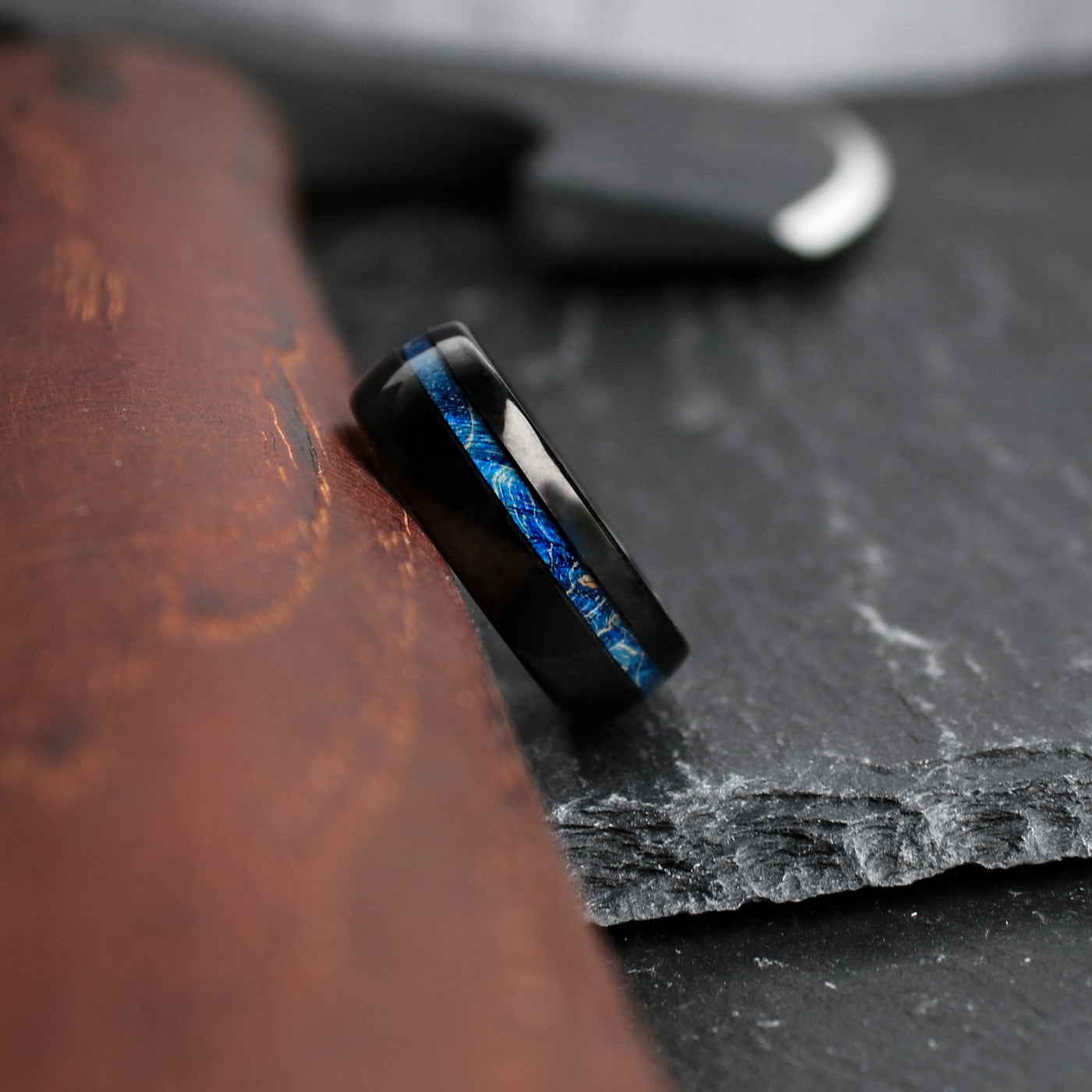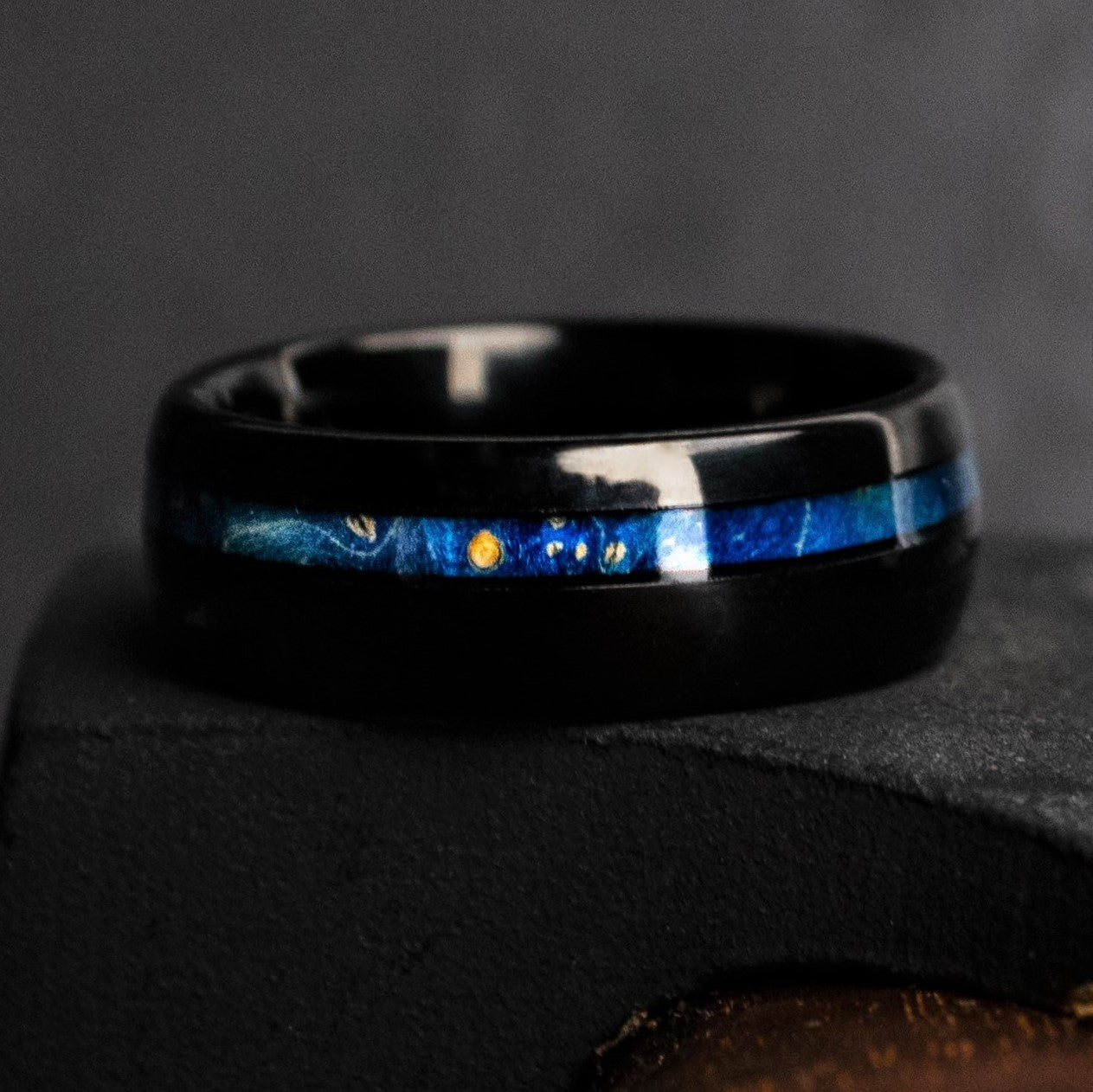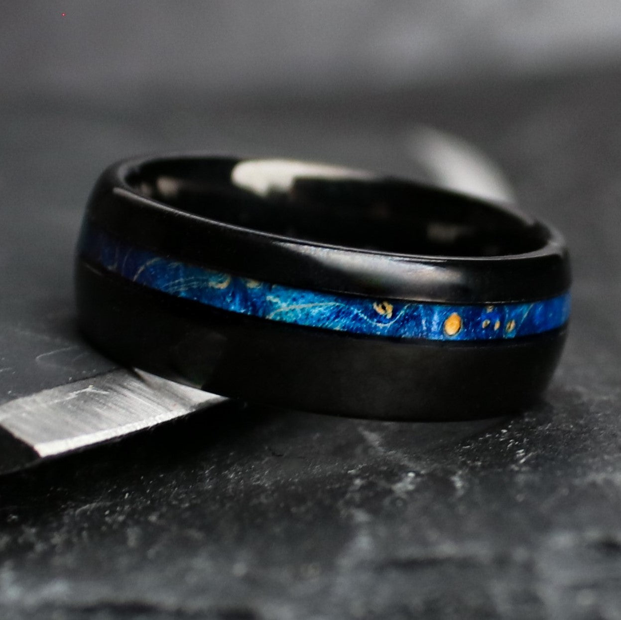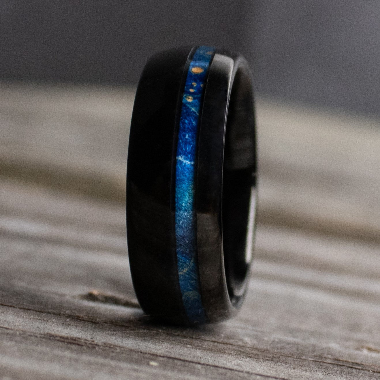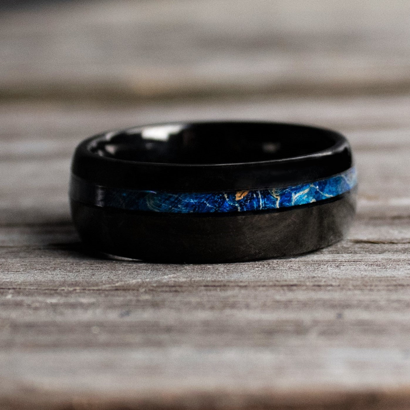 Buckeye burl is one of the most difficult to work, and rare species of timber in the world. Just like Van Gogh's Starry Night, the timber's characteristic stars (stems) are speckled throughout the deep blue enhanced sky (figure) tone throughout. Although it is one of the most difficult timbers we work with, the end result is always worth it. We paired this Buckeye Burl with some semi-matte black Tungsten Carbide.