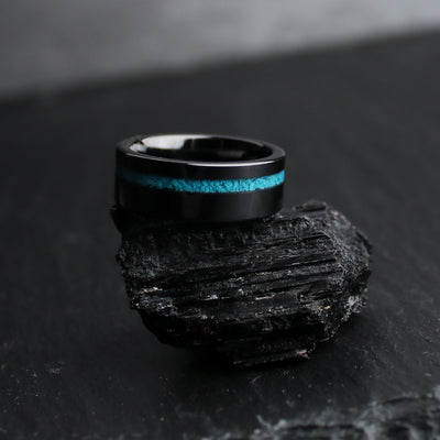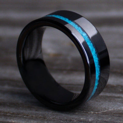 Arizona Turquoise has distinctive bright blue tone. In this design we pair the natural Turquoise with a hardened gunmetal black Ceramic. Black Ceramic encases the entire design in a strong, rigid shell. Ceramic is an incredibly durable modern material. It will never scratch, scuff, nor fade. The black is part of the material, and isn't a finish.
