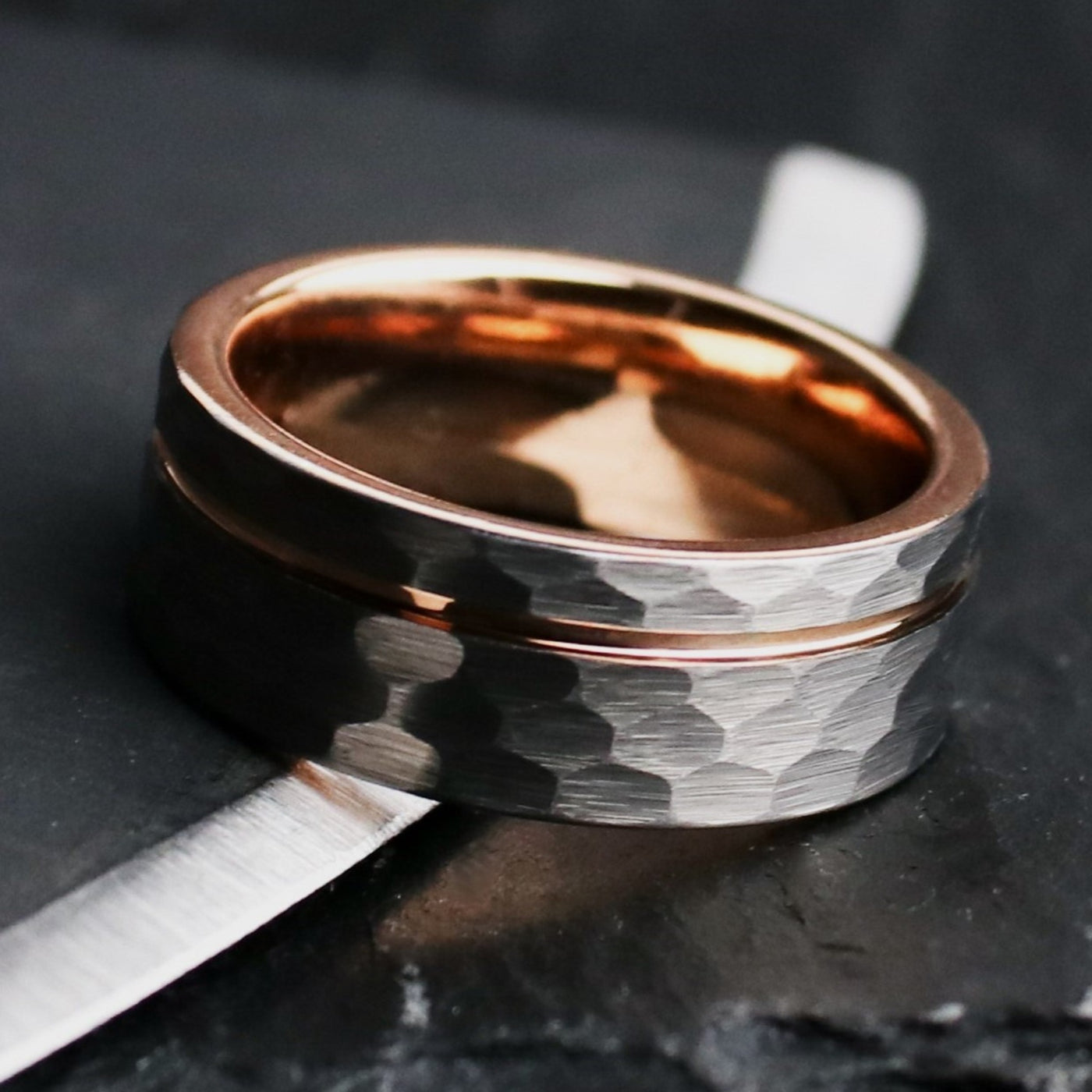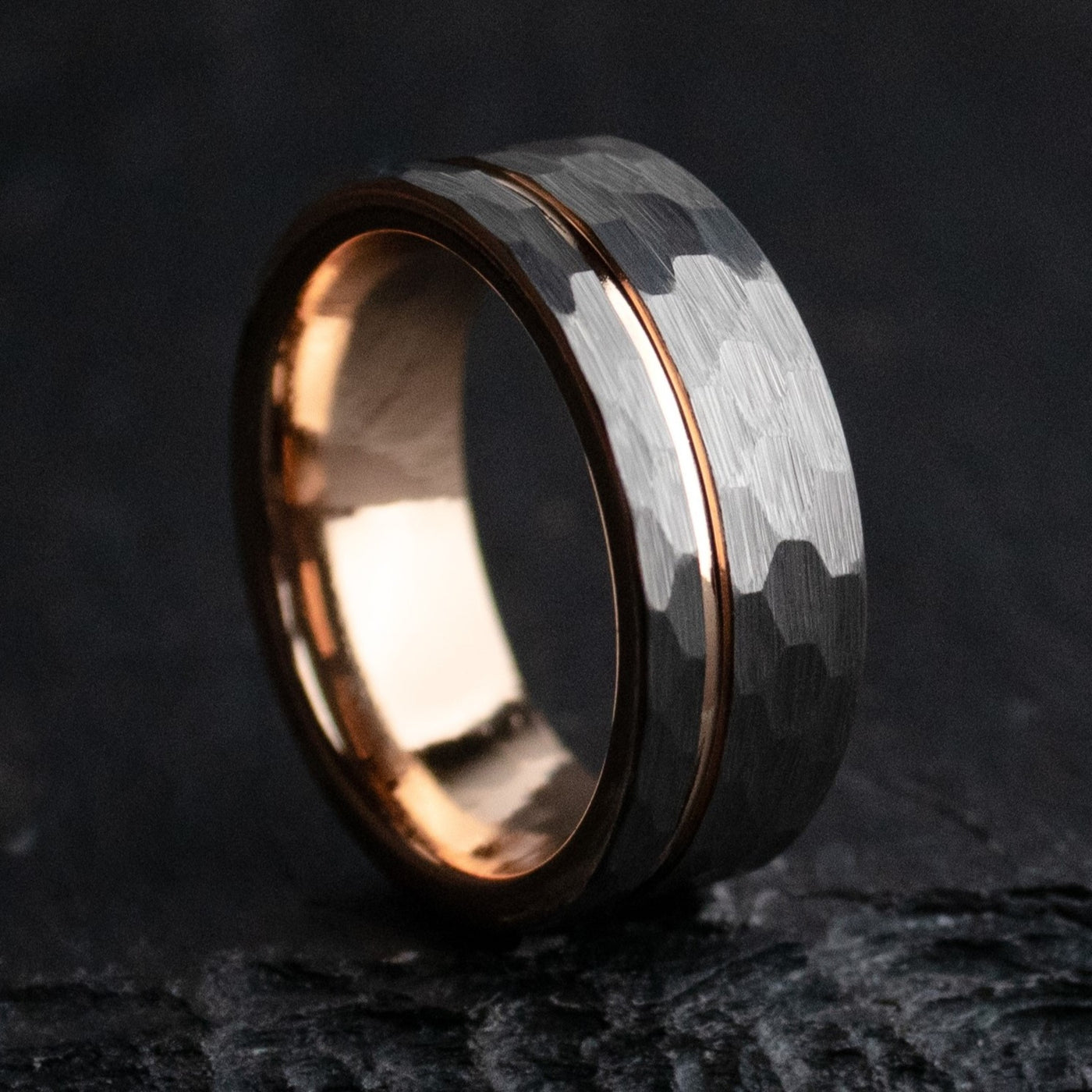 We use Tungsten Carbide to cut Titanium. That's how strong it is. It's an absolute marvel of modern engineering, and ranks a 9-9.5 on Mohs hardness scale (scales out of 10). This design pairs a rustic, hammered, gray tungsten carbide exterior, with a rose gold coated inlay, and interior. The ring is forged via sintering in an industrial mold, and I polish it with diamond paste.