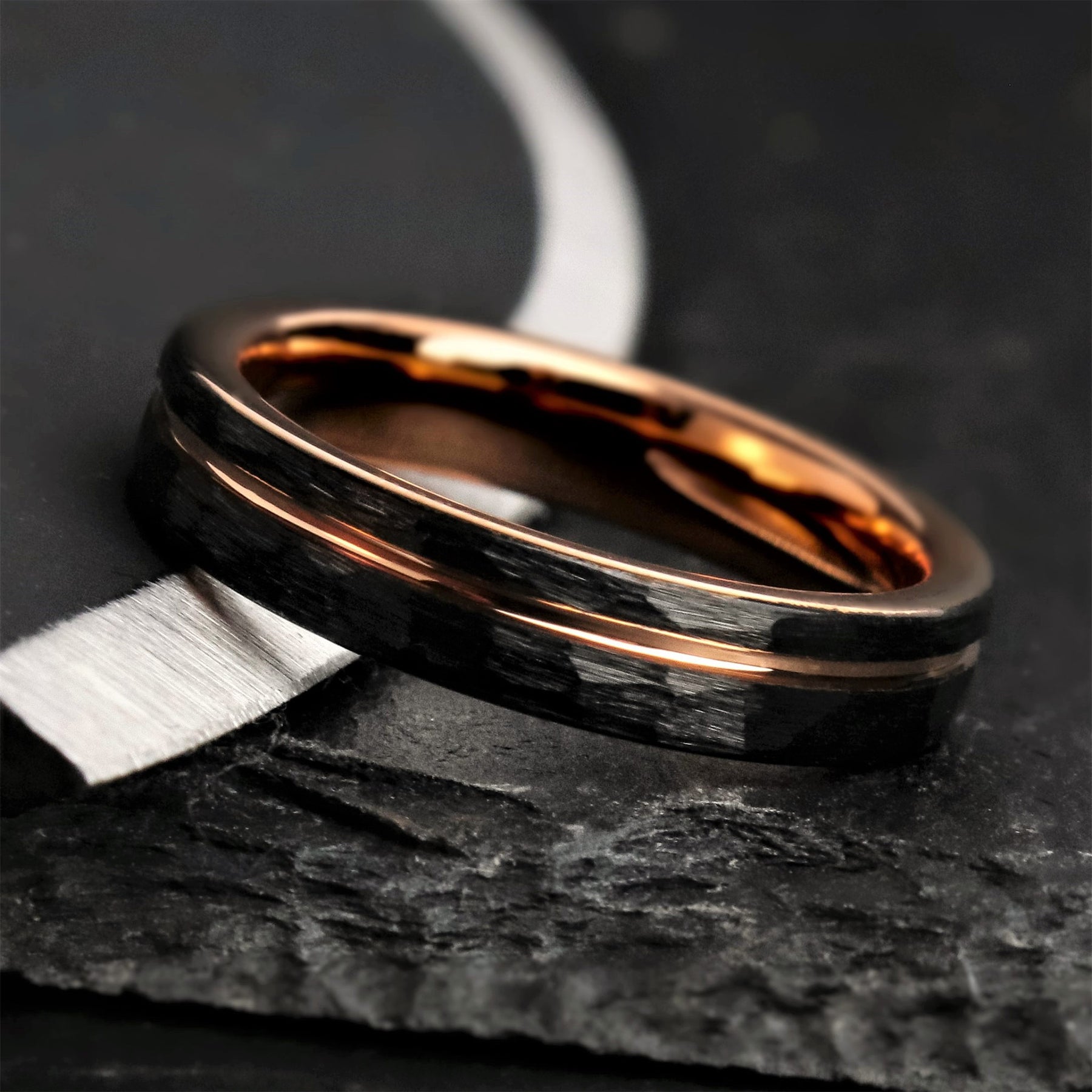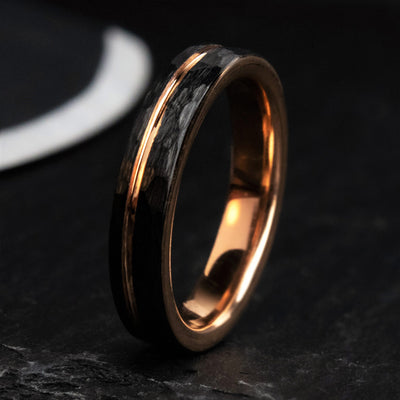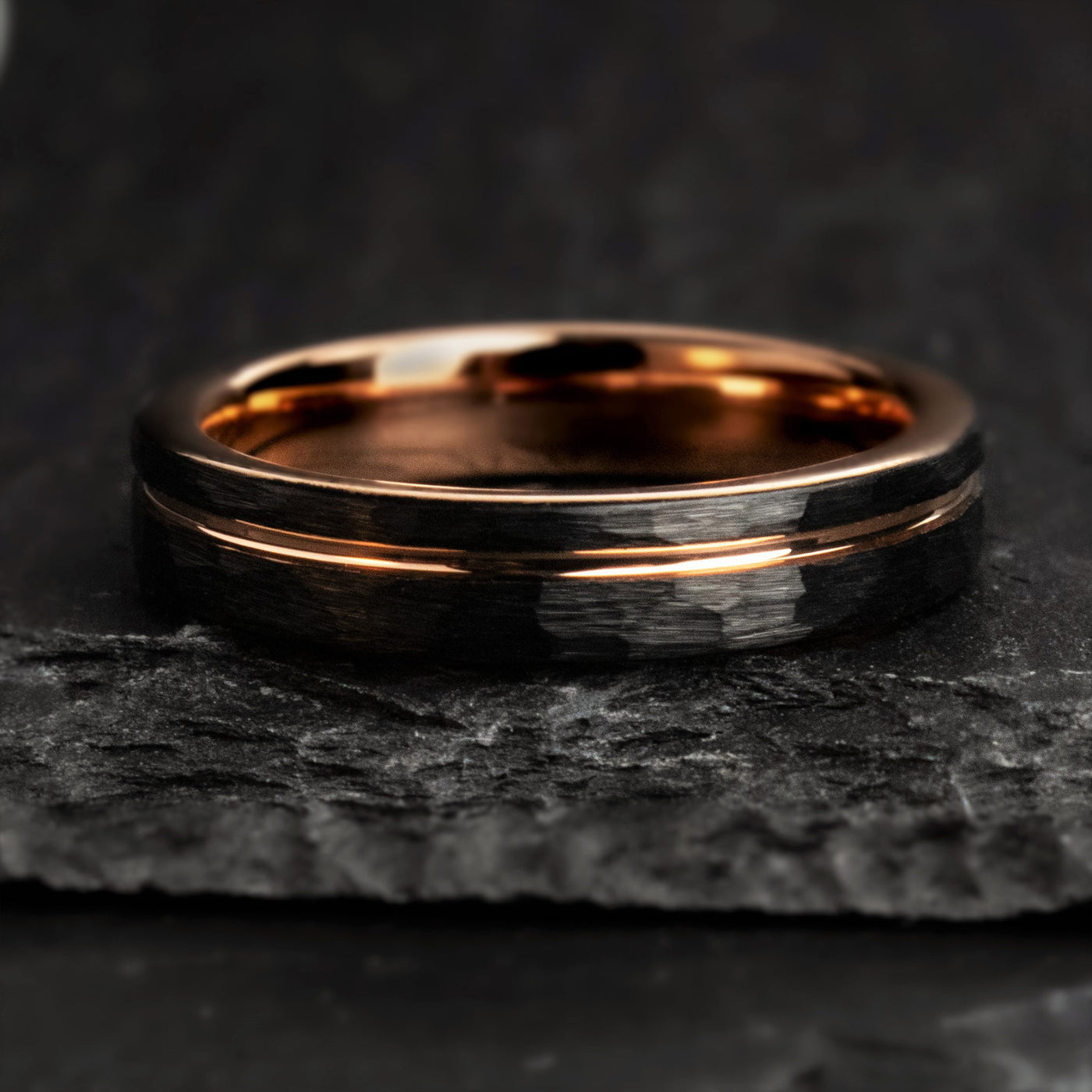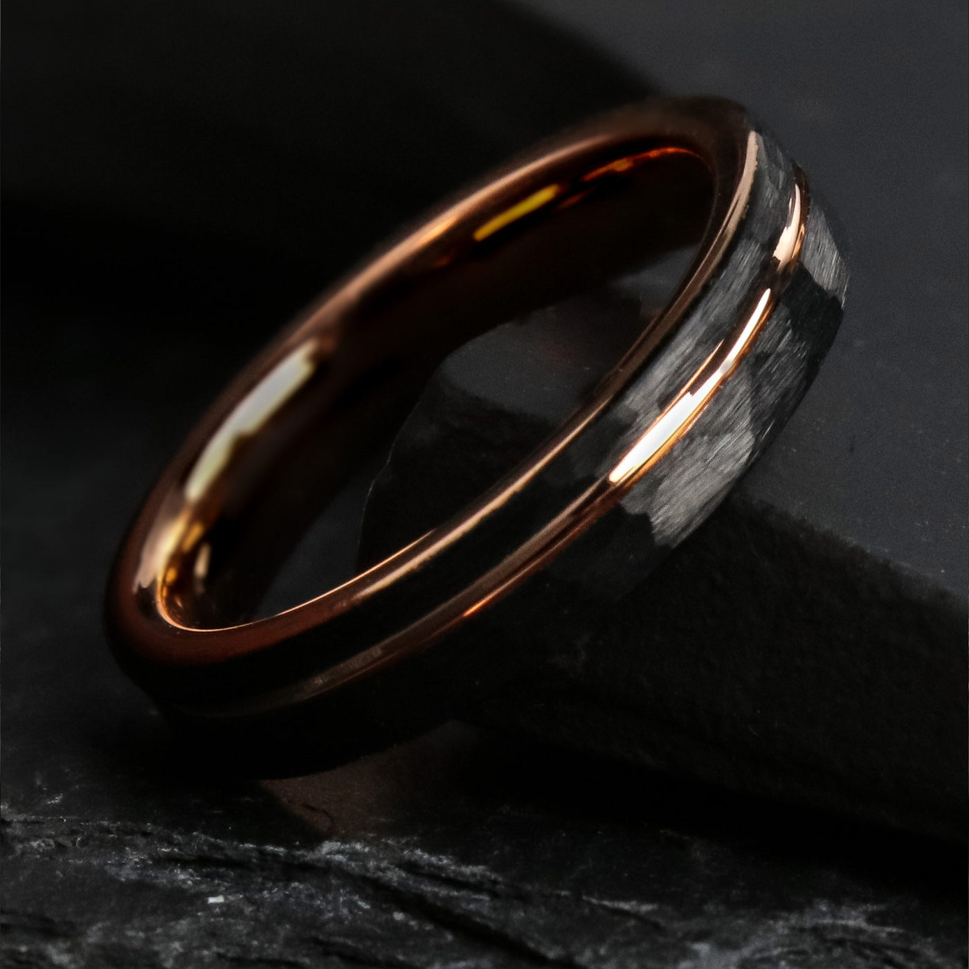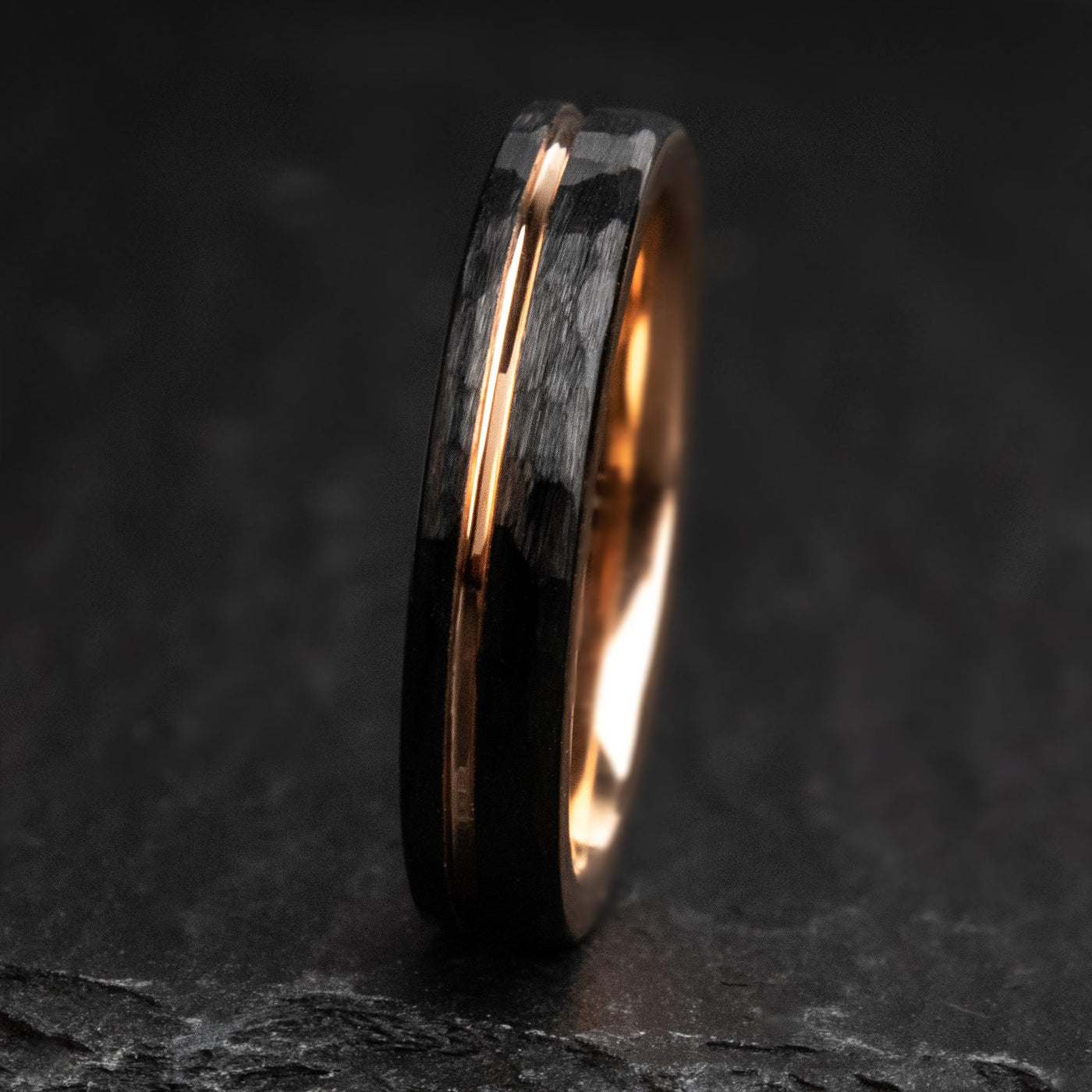 We crafted this unique wedding band by pairing a rustic hammered aesthetic, with a Rose Gold inlay and interior. The slim Apollo has, by far, been the most requested ring this year.