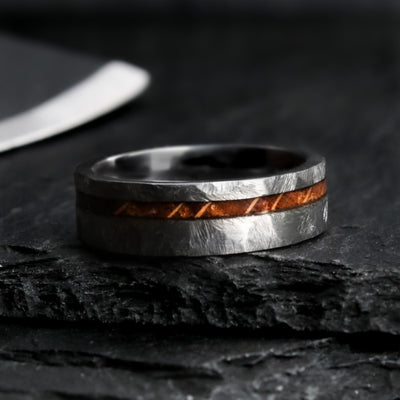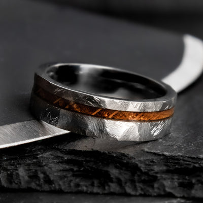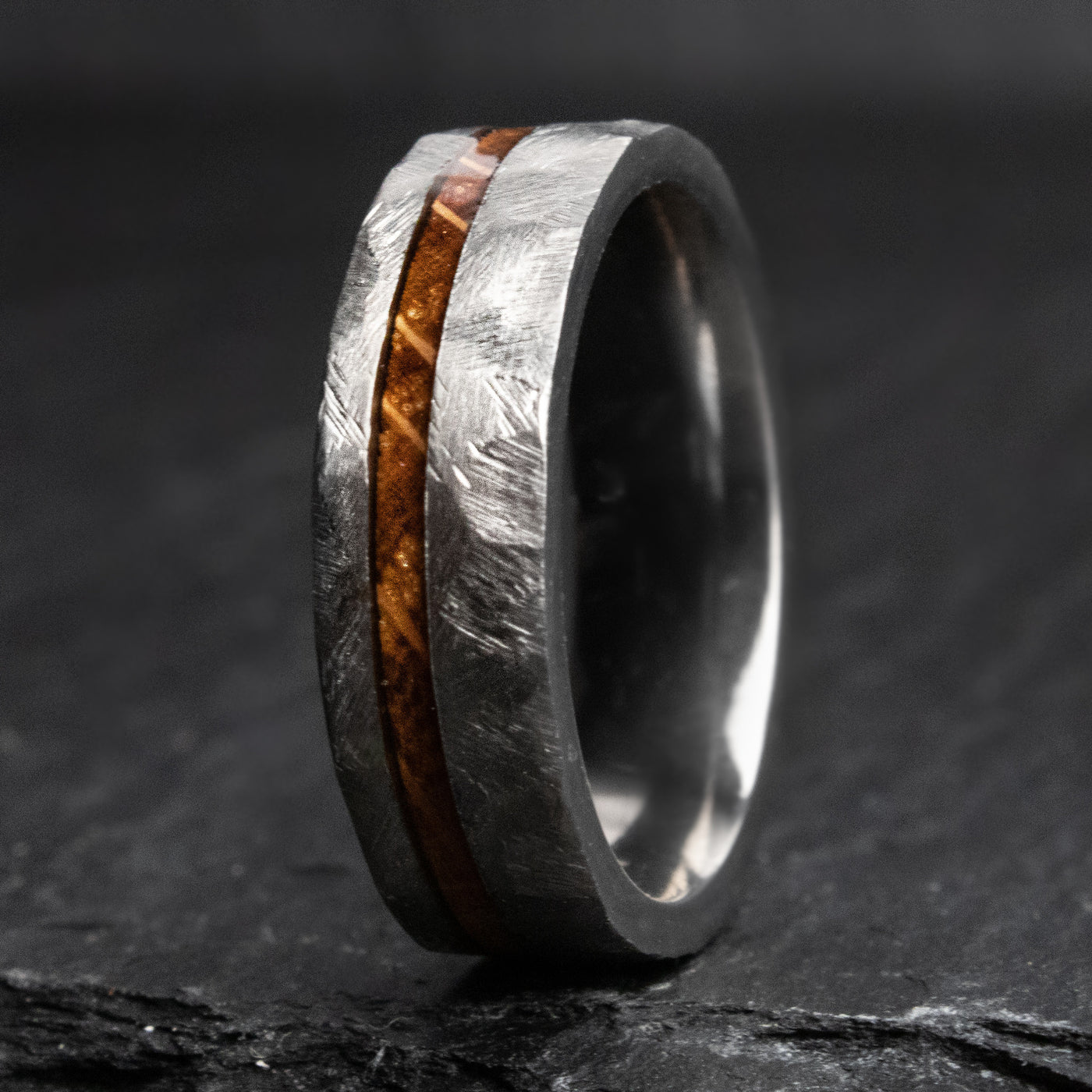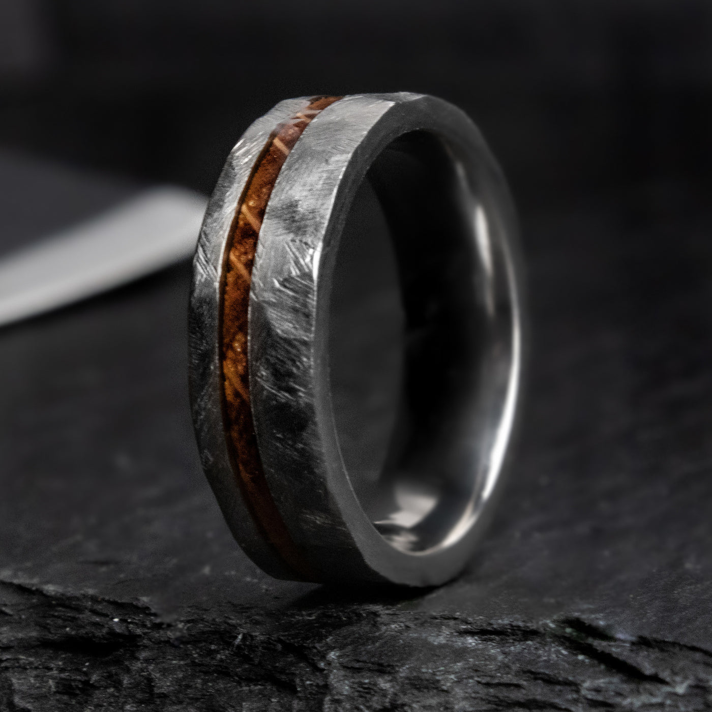 Hammered Titanium meets whiskey barrel in this unique and rustic wedding band. Powerful and nuanced: Old growth whiskey barrel's grain pattern flows from deep coffee browns throughout bright white sapwood.