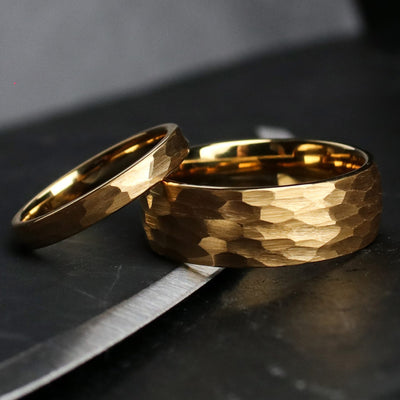 Tungsten Carbide is the paragon of modern metalworking. Your ring is eternal, and will always look just like the day you received it. Jeweler's grade Tungsten Carbide is prized for its durability, strength, and that it's entirely hypoallergenic. The Tungsten Carbide is IP plated in a vacuum with an 18k yellow gold aesthetic.
