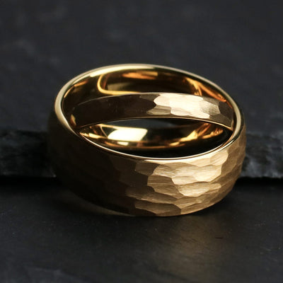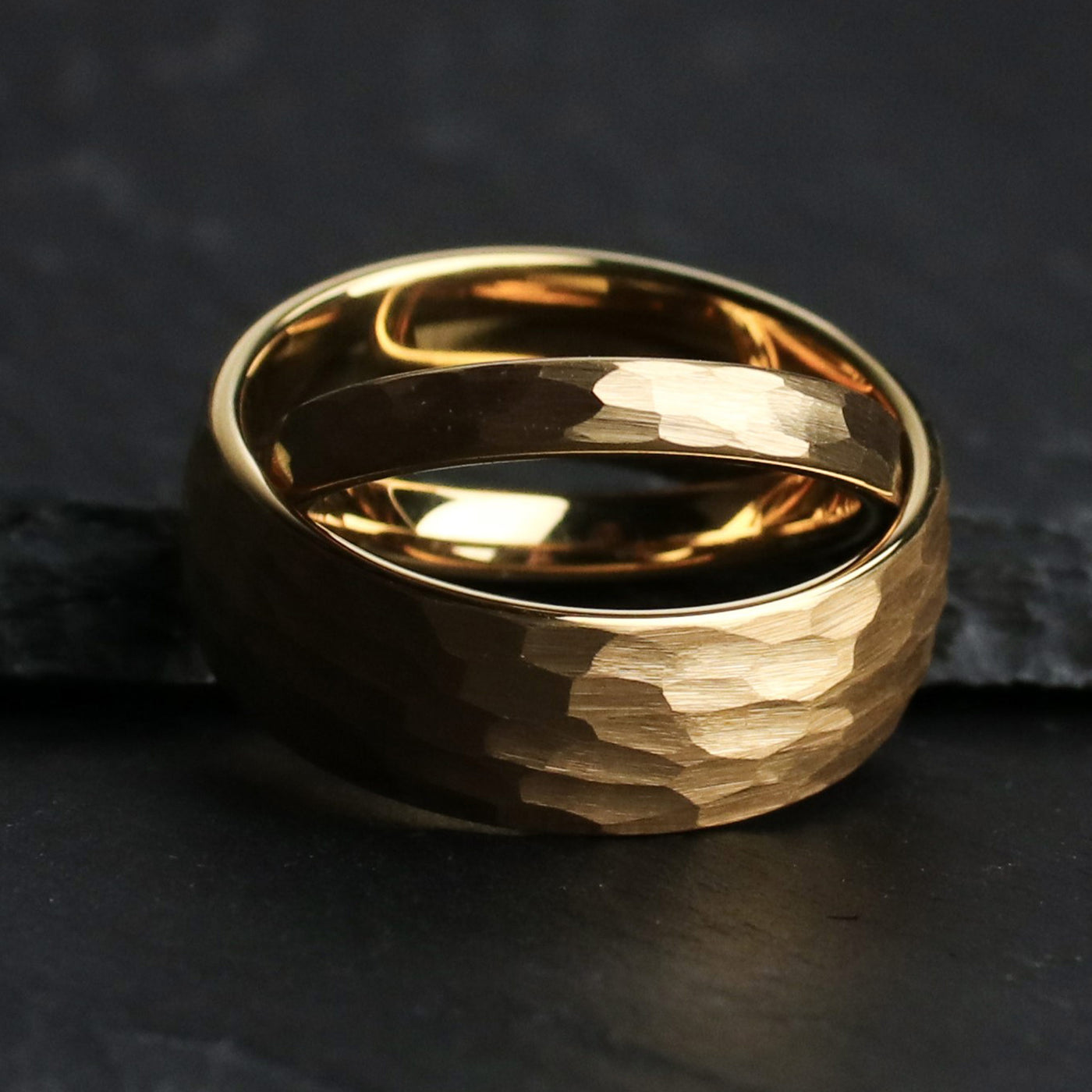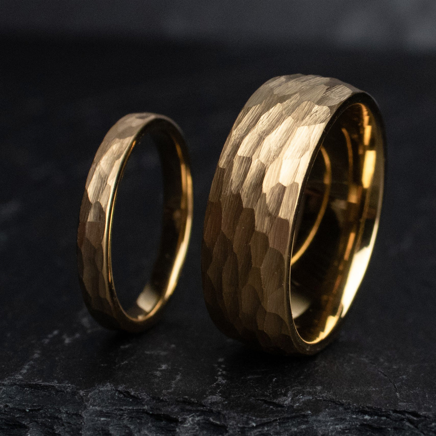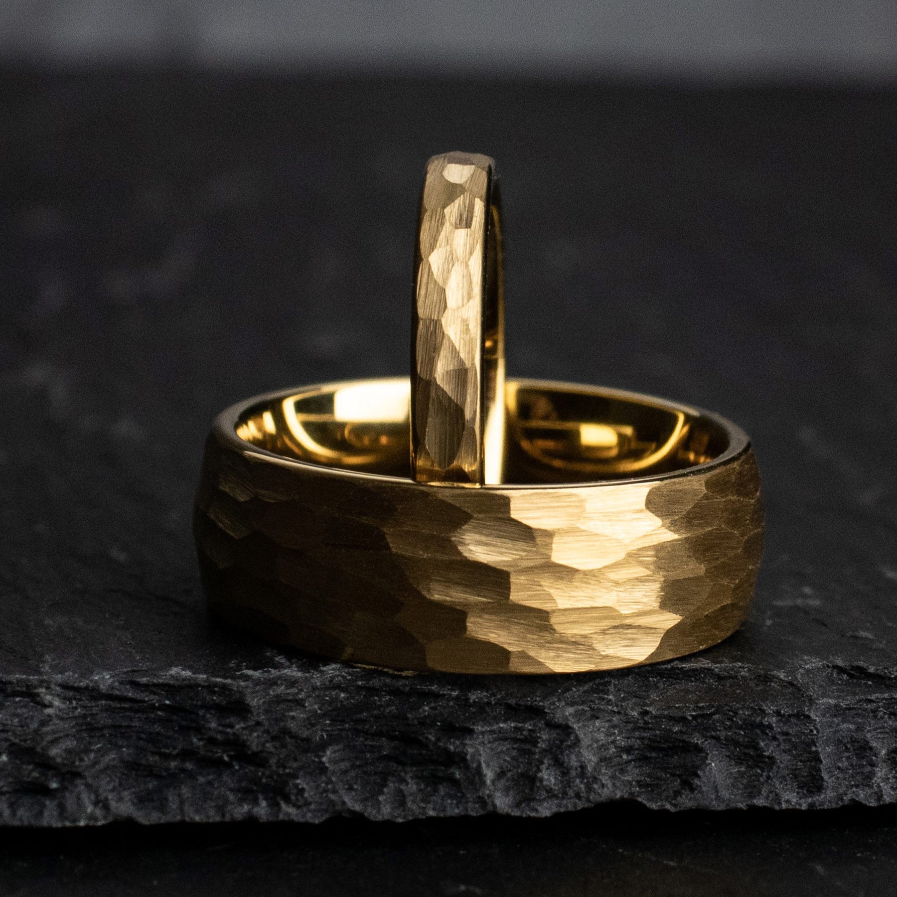 Freya or Freyja is the ancient Norse god of love, beauty, battle and gold. This modern, yet rustic, hammered gold wedding band aptly fits its name.