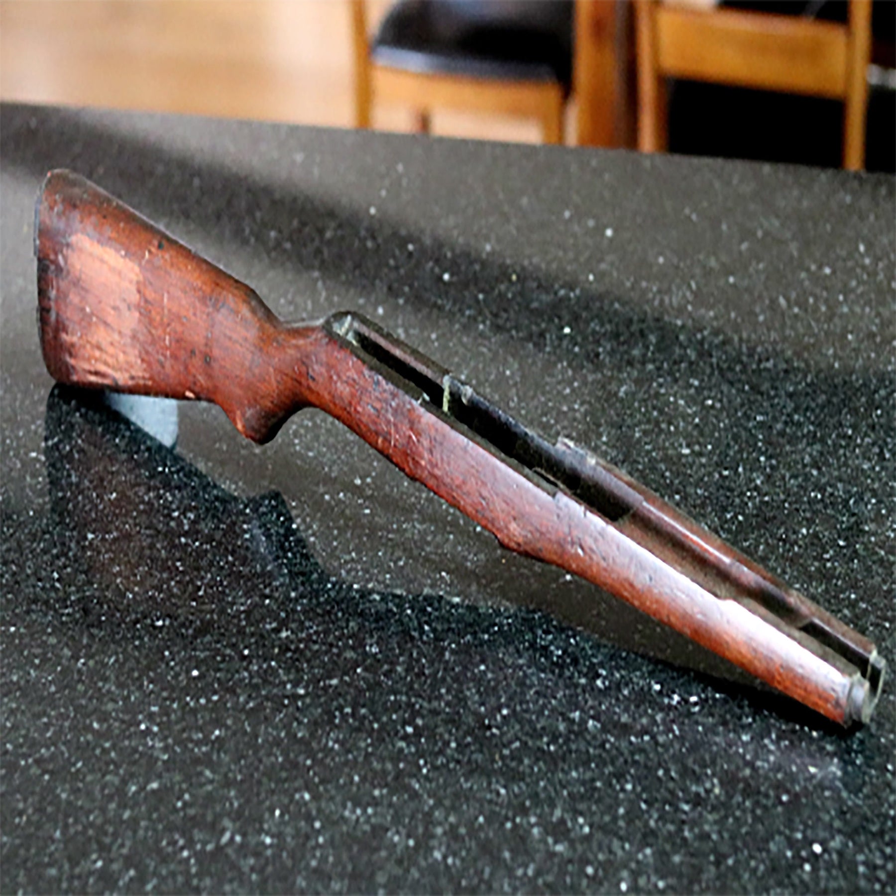This stock has seen active duty, but has been broken beyond repair. We stabilize the timber in a vacuum and paired it with sandblasted Tungsten Carbide for this unique design.
